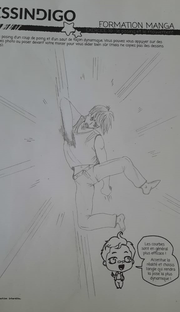 Hello EstelleTh! C'est une pose bien dynamique qui envoie! Mais attention à ce que ça fasse naturel. Ici le corps ne paraît pas avoir une position très logique dans son mouvement. N'hésite pas à toi-même mimer un mouvement pour voir comment ton corps bouge et se positionne! :)