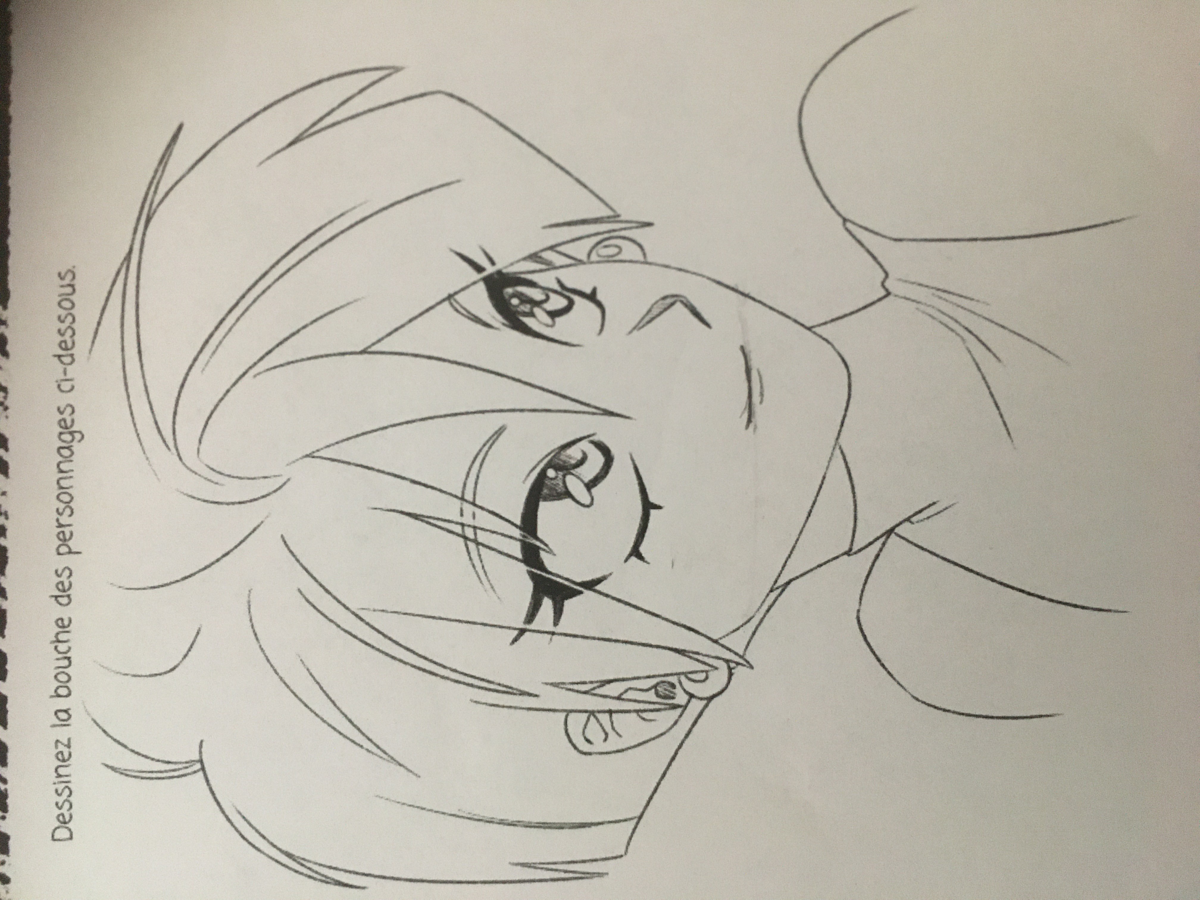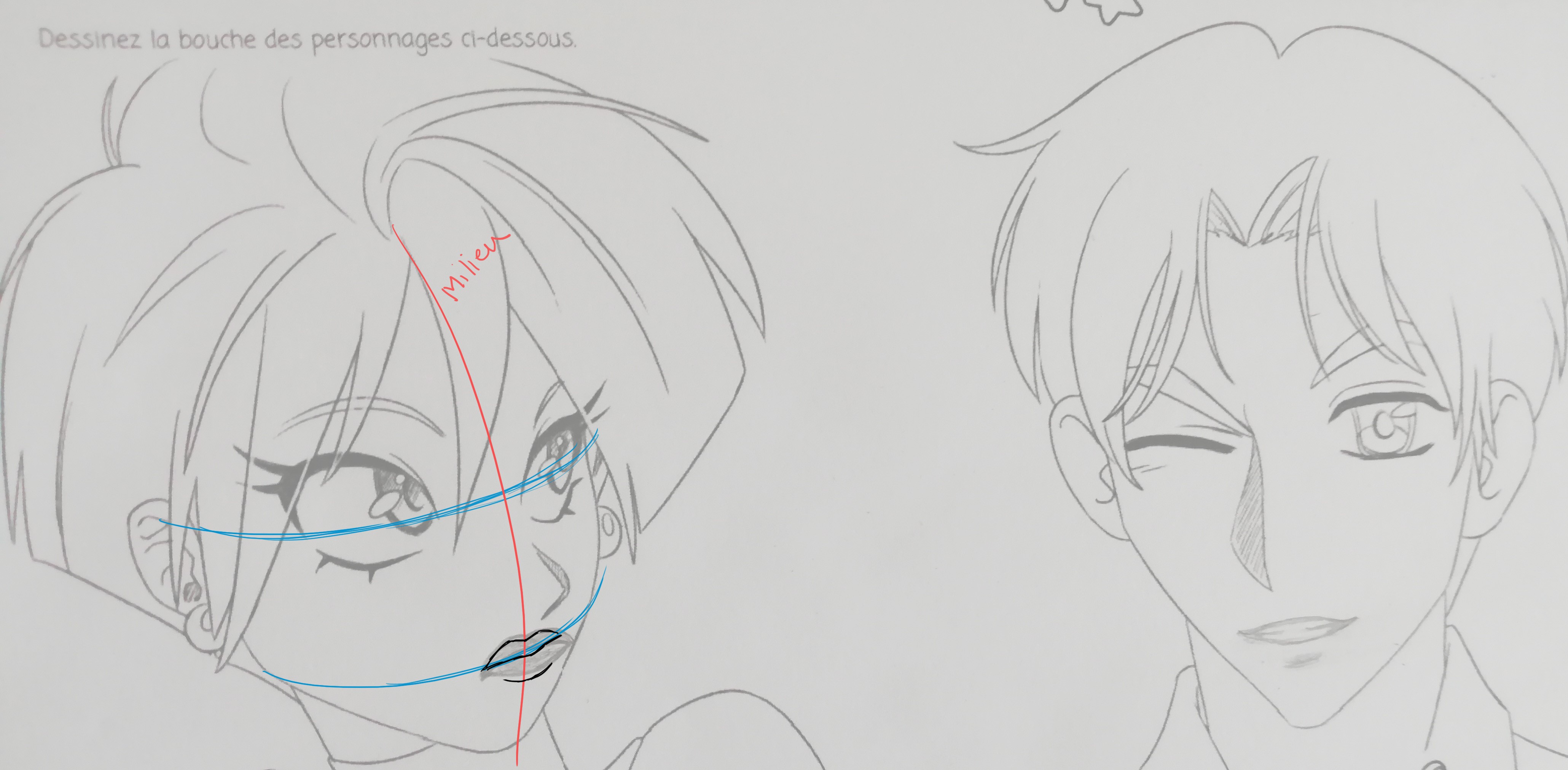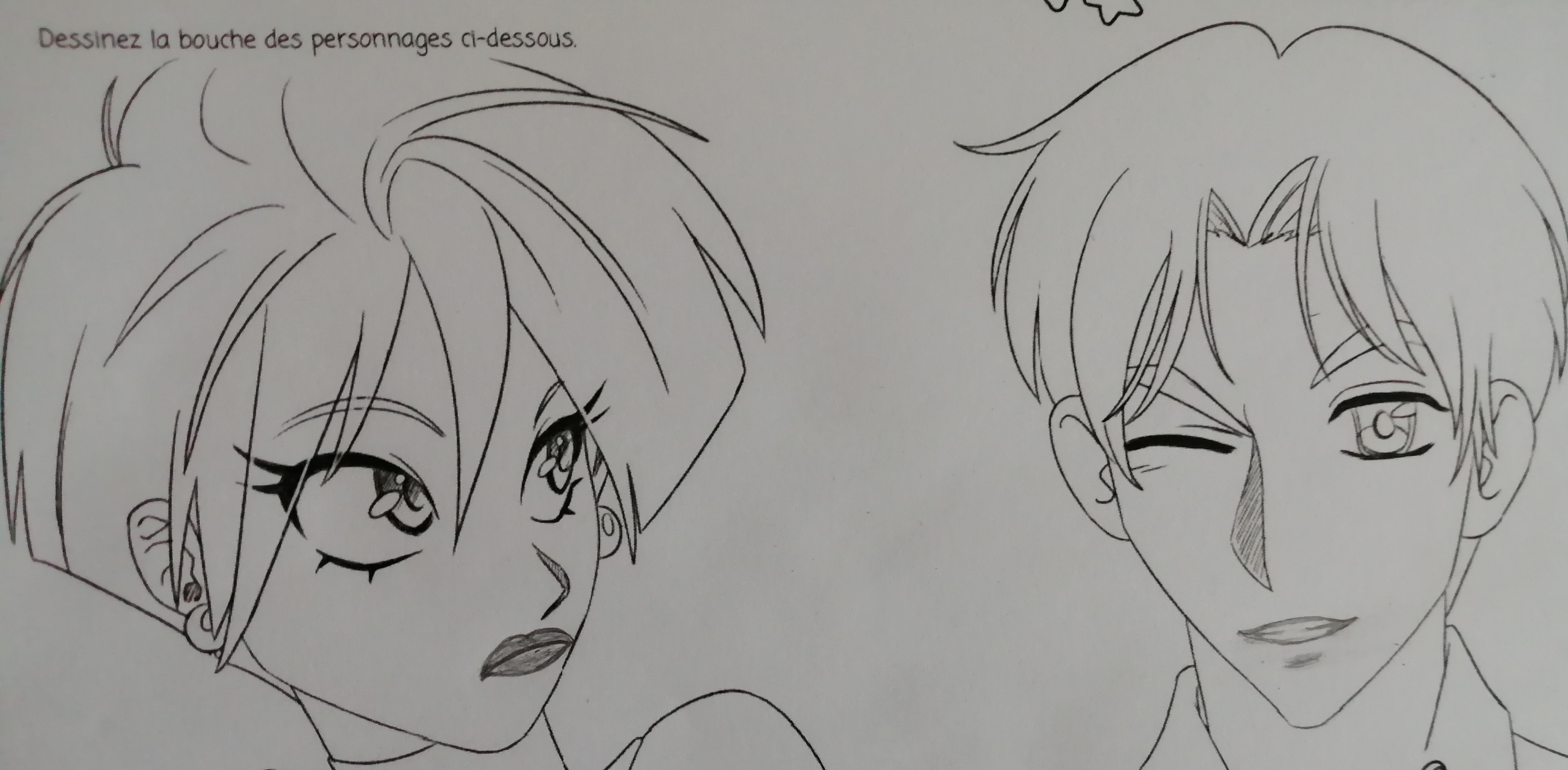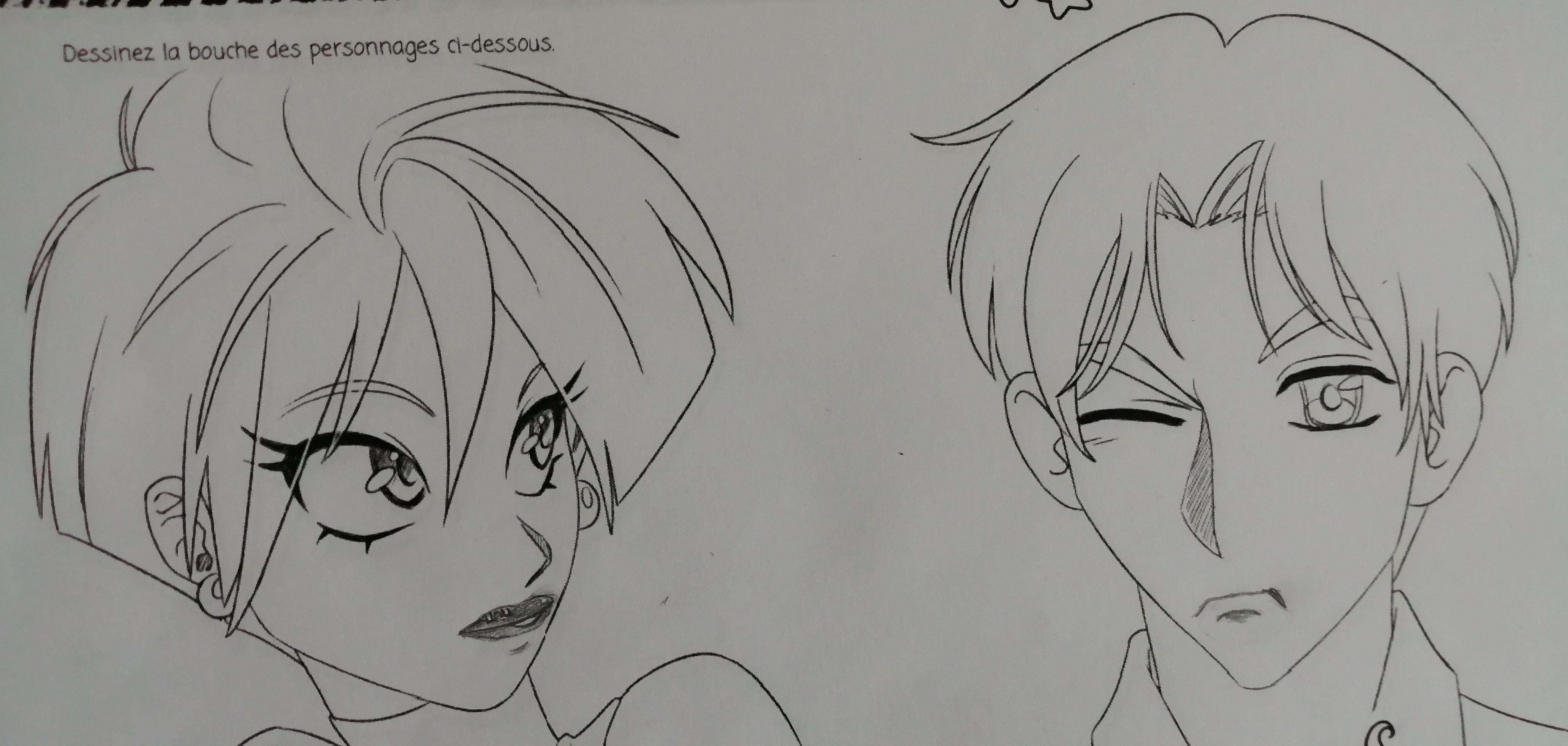Sur la deuxième image, c'est un poil plus compliqué. Pour la demoiselle, j'ai l'impression que sa bouche est trop grande et trop inclinée et pour l'homme, si tu avais dessiné le personnage plutôt que de reprendre la base que j'ai donnée, tu aurais pu allonger son visage légèrement. Il ouvre la bouche, donc ses mâchoires s'écartent et son visage s'allonge (pareil, le miroir est utile pour observer ça dans la vraie vie). Dans le style manga on peut tricher et faire "déborder" la bouche du visage carrément, donc en soi ça fonctionne, perso j'aurais allongé un peu le visage, mais c'est subjectif pour le coup. Le dessin de la bouche fonctionne très bien tel quel :3