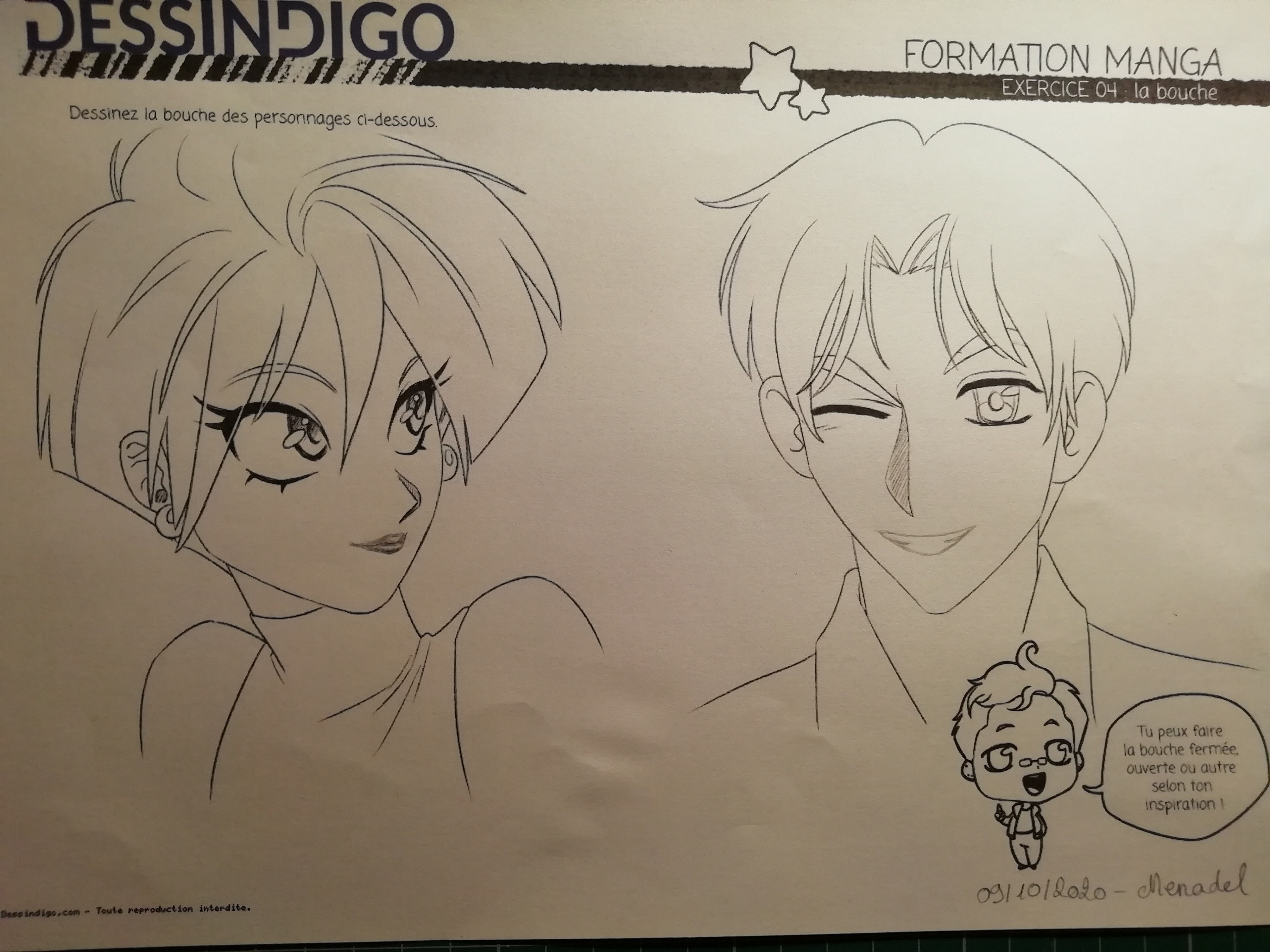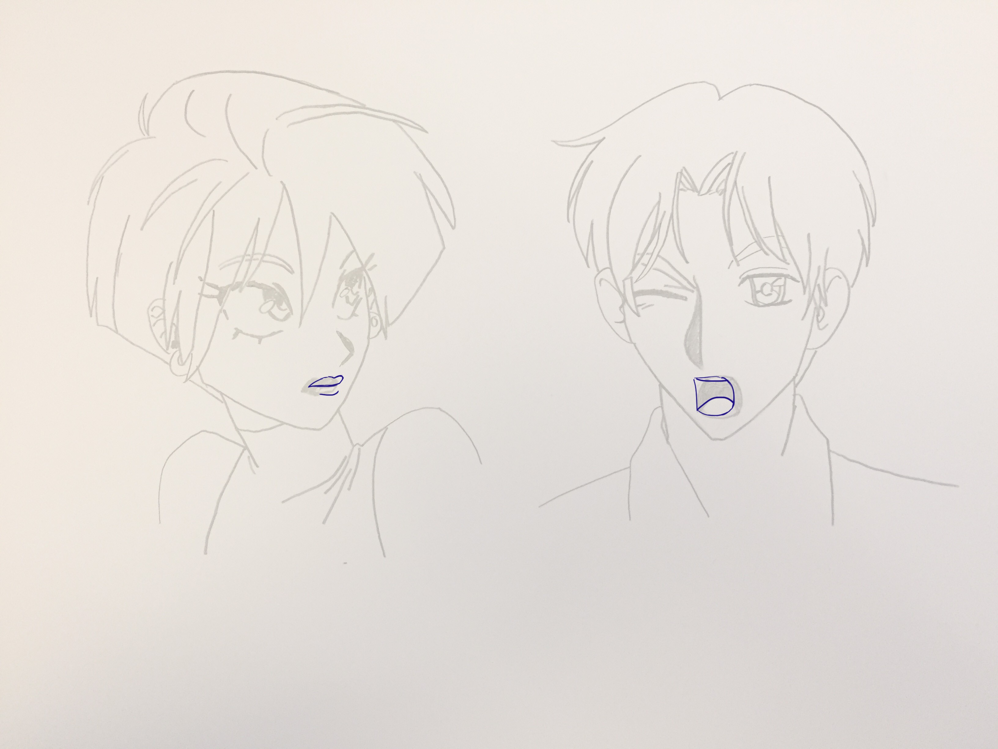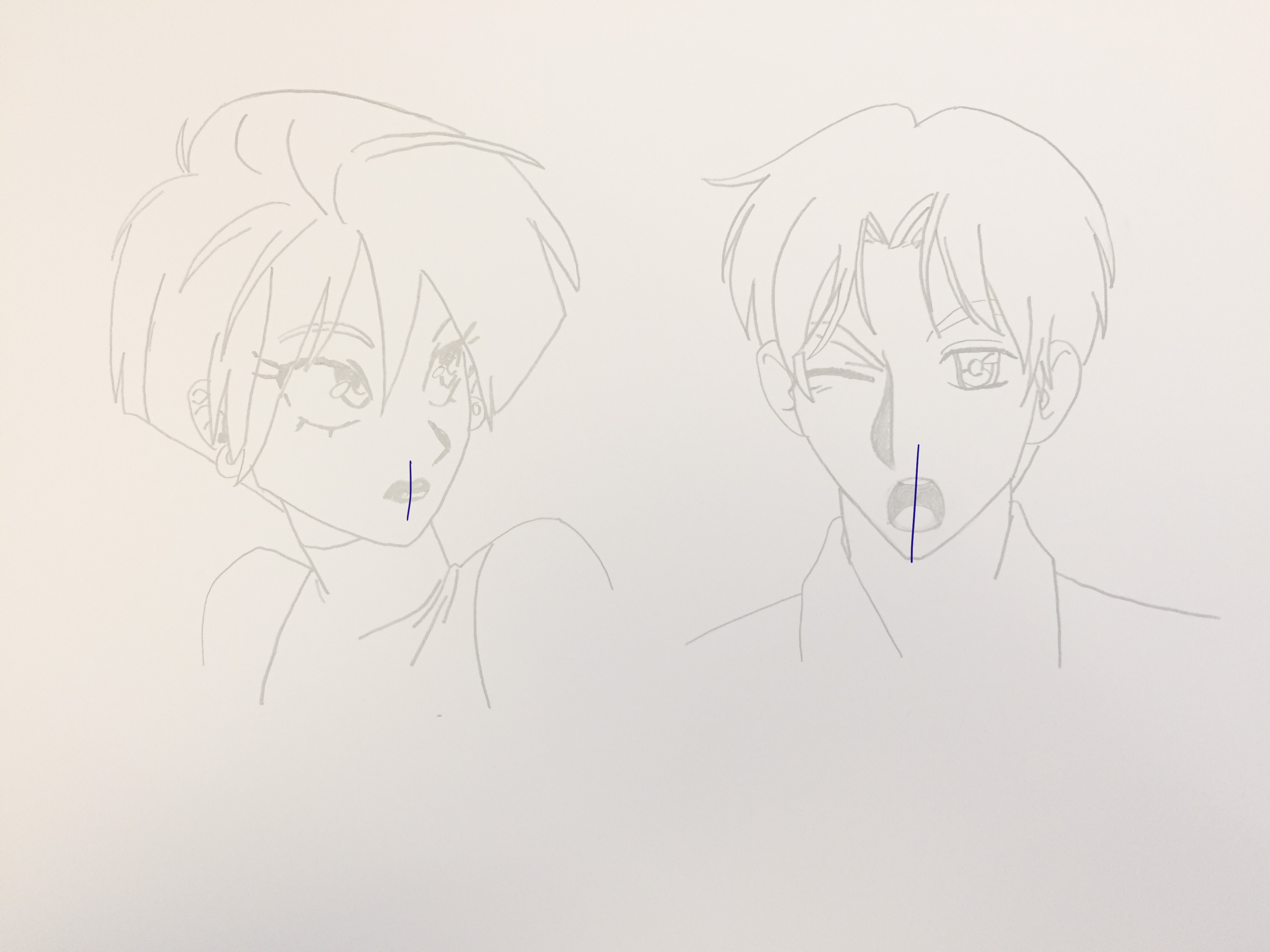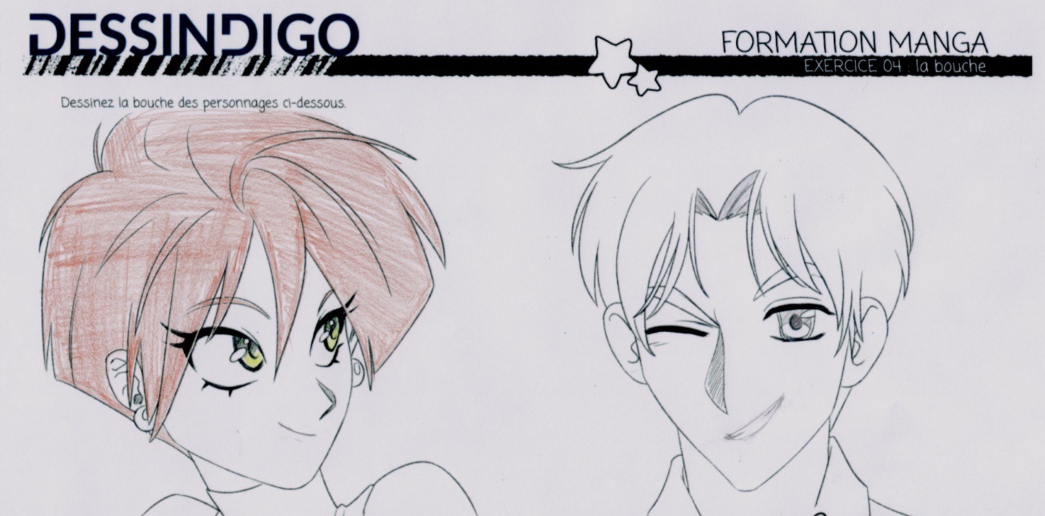 Sur la deuxième image, c'est un poil plus compliqué. Pour la demoiselle, j'ai l'impression que sa bouche est trop grande et trop inclinée et pour l'homme, si tu avais dessiné le personnage plutôt que de reprendre la base que j'ai donnée, tu aurais pu allonger son visage légèrement. Il ouvre la bouche, donc ses mâchoires s'écartent et son visage s'allonge (pareil, le miroir est utile pour observer ça dans la vraie vie). Dans le style manga on peut tricher et faire "déborder" la bouche du visage carrément, donc en soi ça fonctionne, perso j'aurais allongé un peu le visage, mais c'est subjectif pour le coup. Le dessin de la bouche fonctionne très bien tel quel :3
