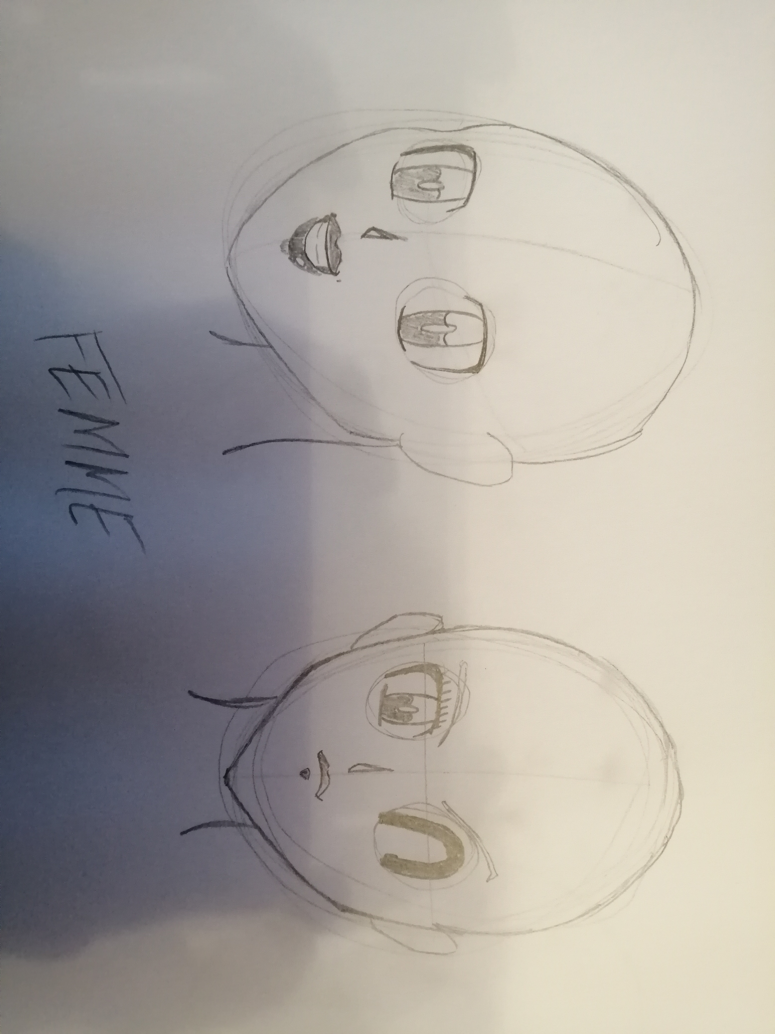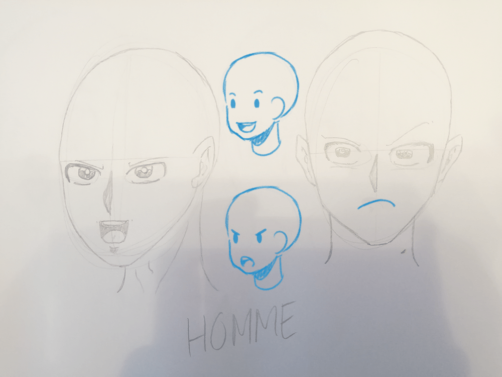 La bouche de l’homme de ¾ j’ai du mal à comprendre son expression. Est ce qu’il est énervé ? Est-ce qu’il sourit ? La forme de la bouche n’est pas suffisamment claire :) Le second, de face fonctionne bien ^^ Cependant j’aurai tout de même agrandi la bouche et redressé plus droite. Mais ta version marche bien aussi :)