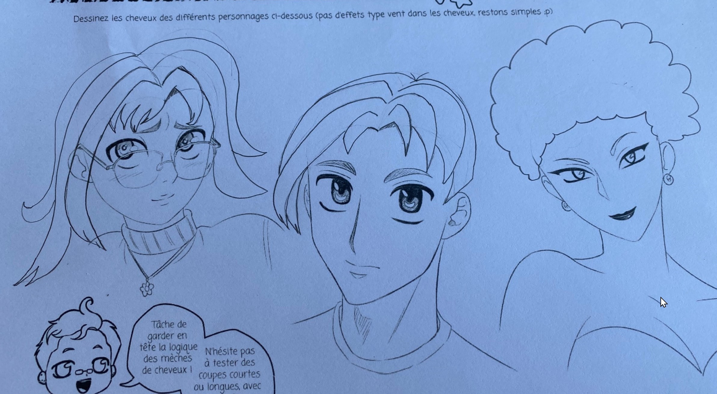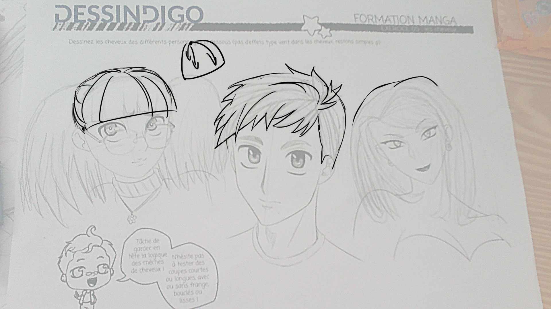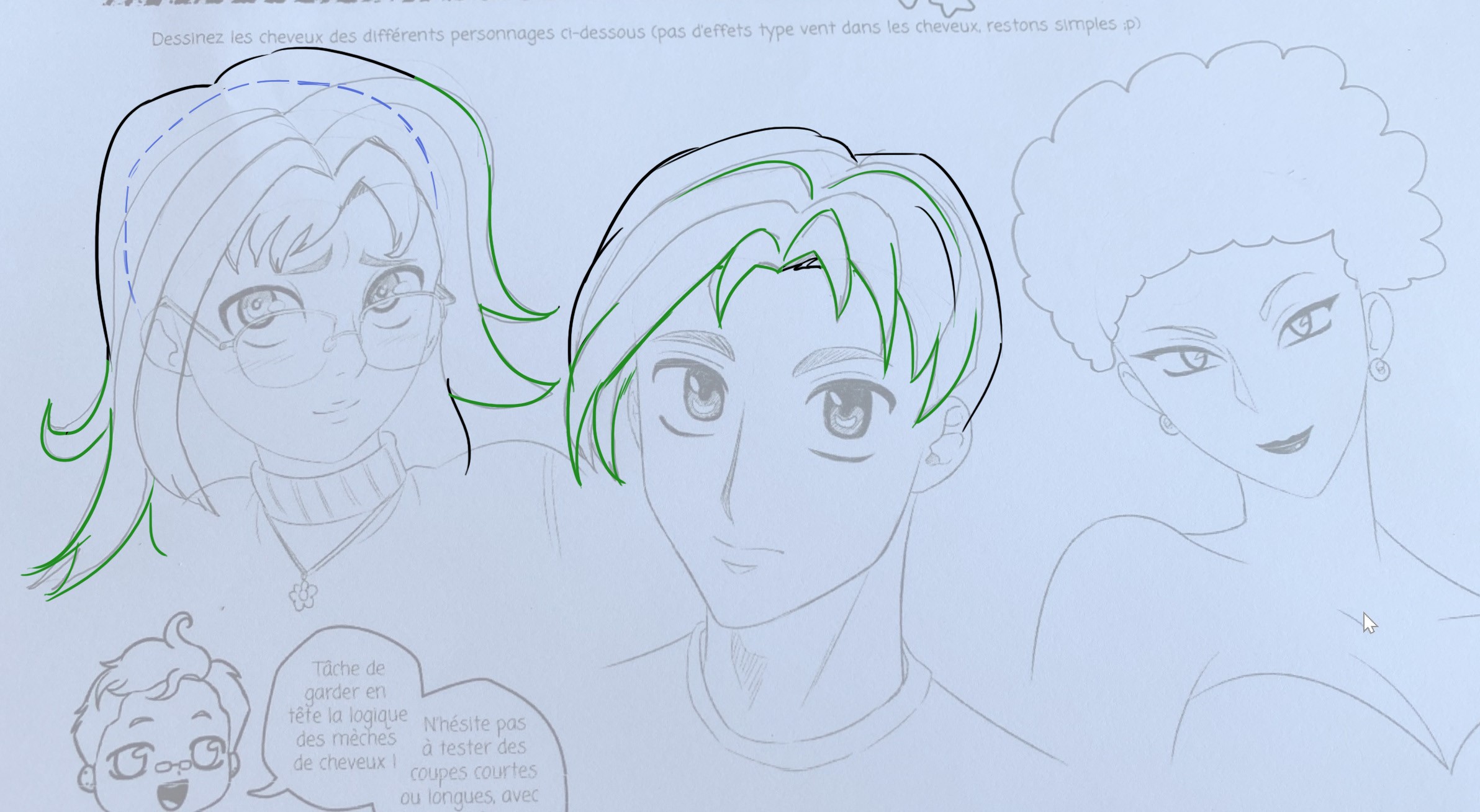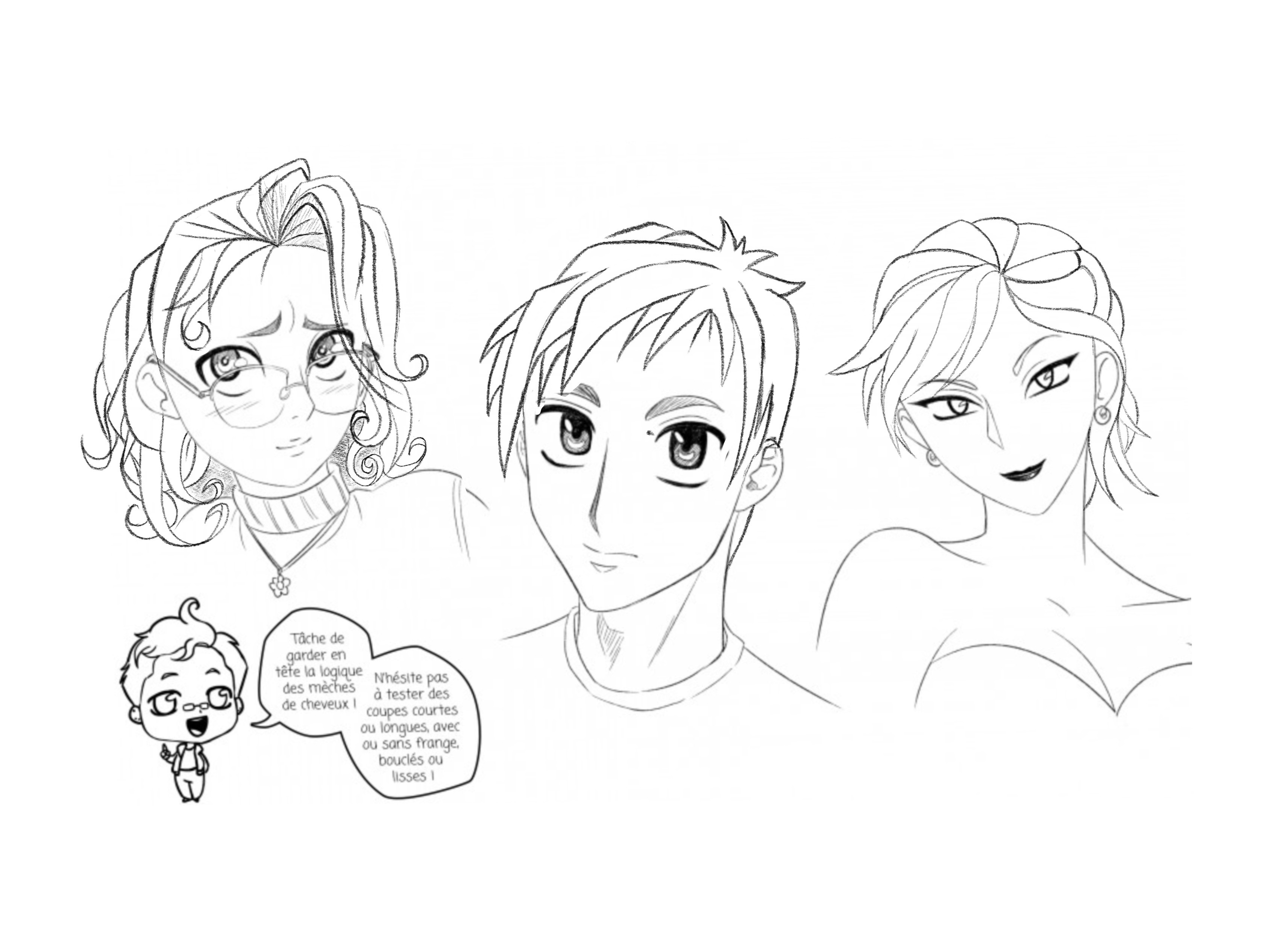 Et pour le tout premier, il manque un bout de cheveux, on devrait normalement voir l'implantation sur le côté droit de la tête. Concernant la frange, fais partir les traits des mèches depuis un point central en n'oubliant pas de suivre le volume (pas tout plat comme ici), la frange est posée sur le front, et le front est bombé, donc je devrais voir des courbes.