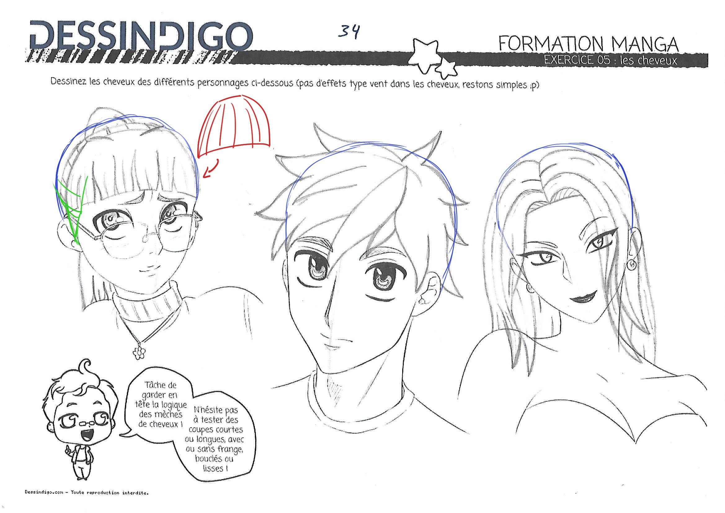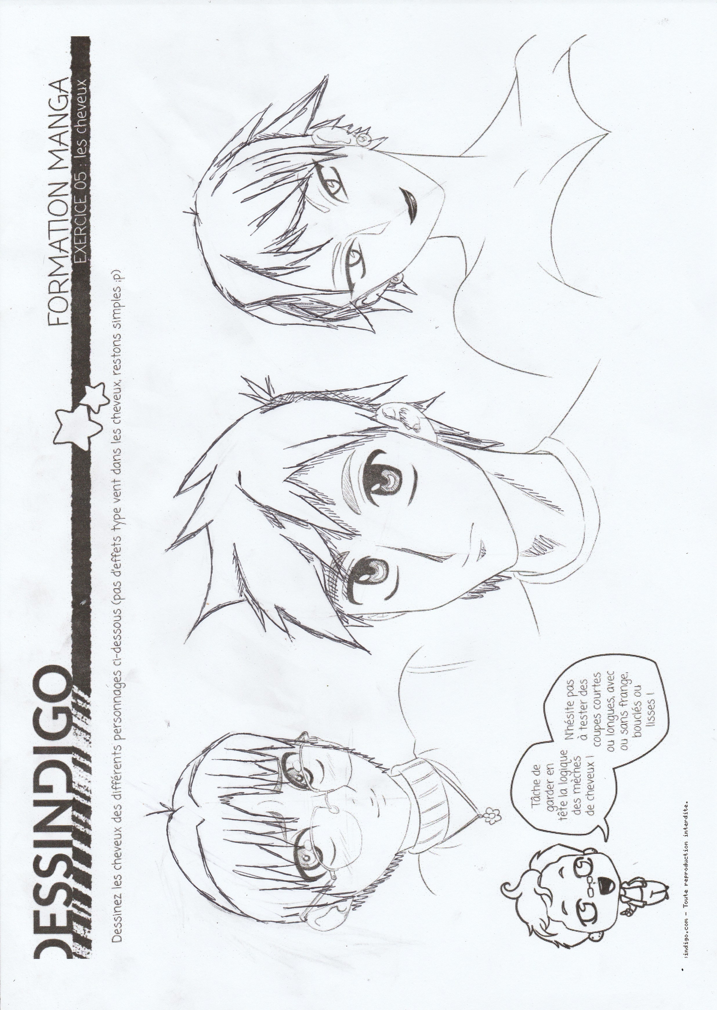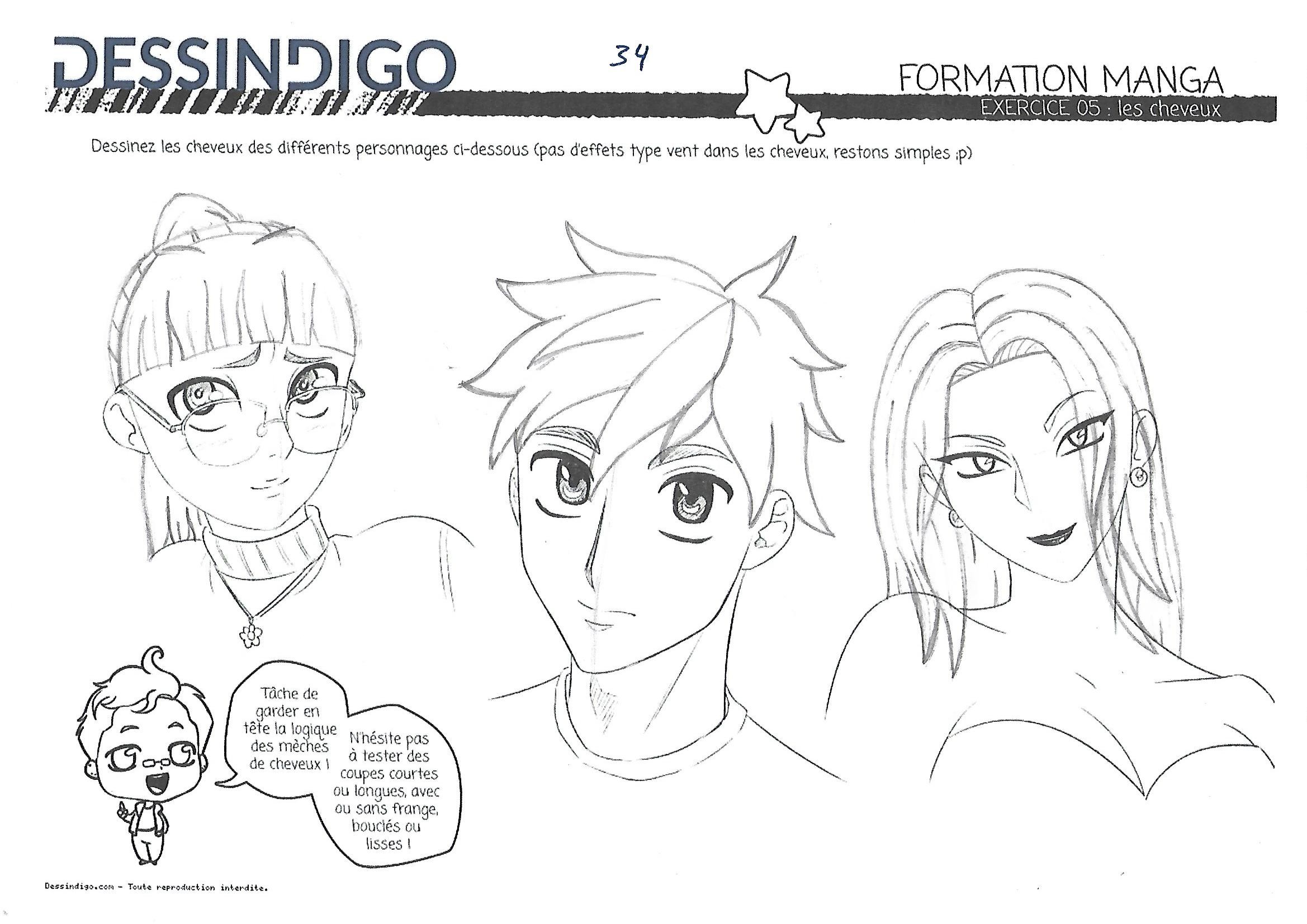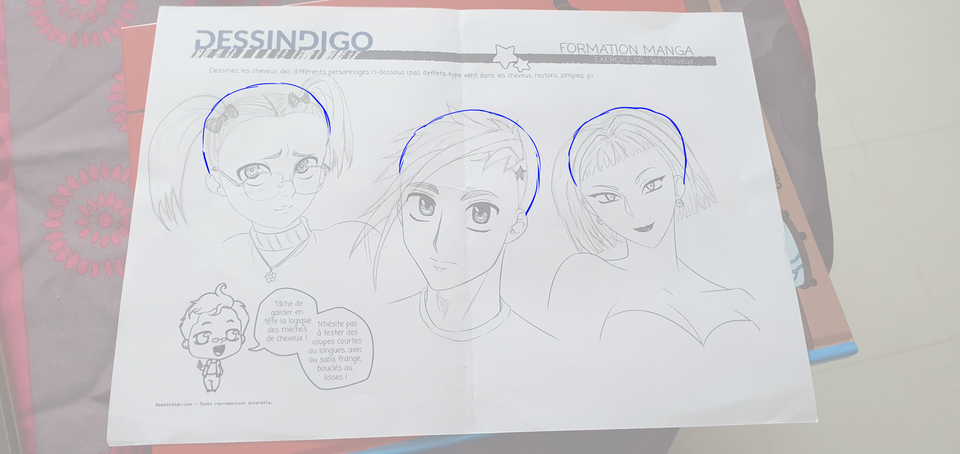 Et pour le tout premier, il manque un bout de cheveux, on devrait normalement voir l'implantation sur le côté droit de la tête. Concernant la frange, fais partir les traits des mèches depuis un point central en n'oubliant pas de suivre le volume (pas tout plat comme ici), la frange est posée sur le front, et le front est bombé, donc je devrais voir des courbes.