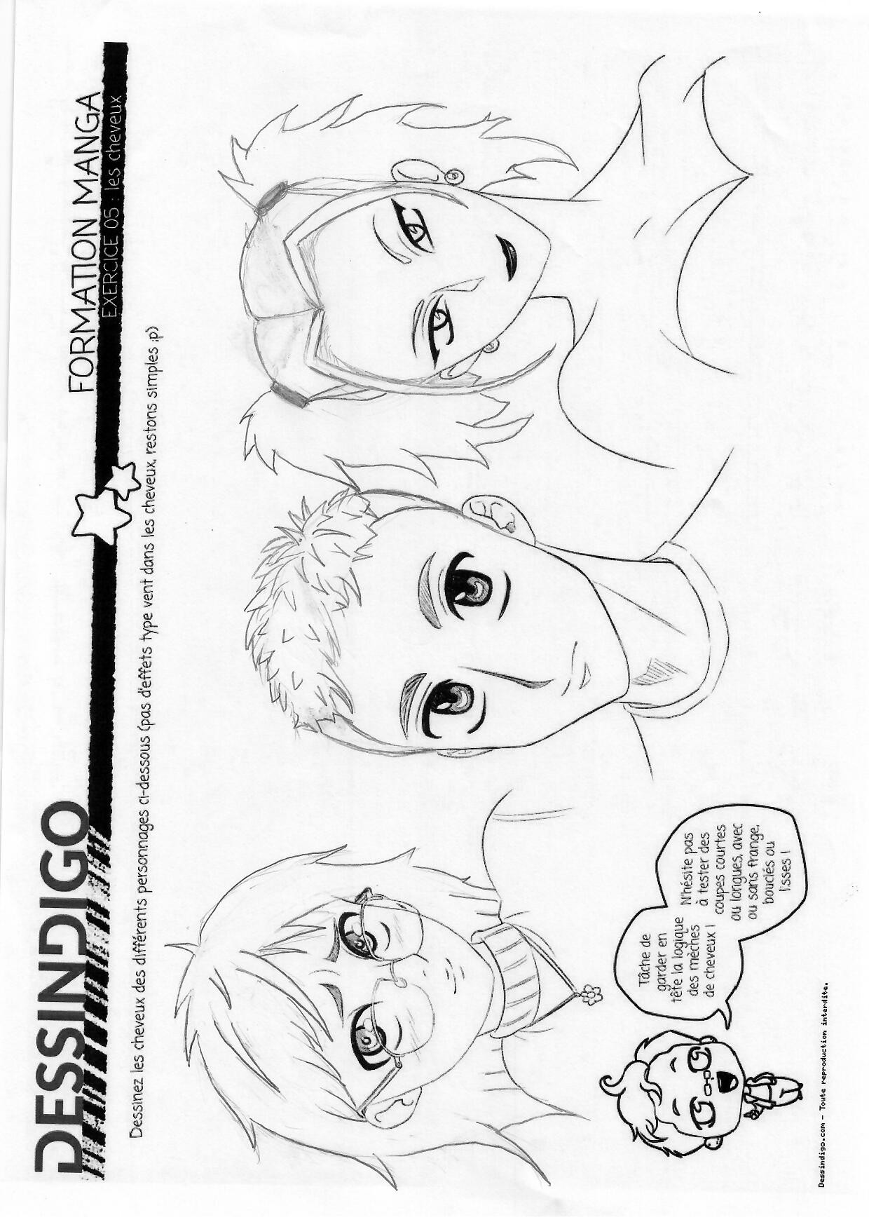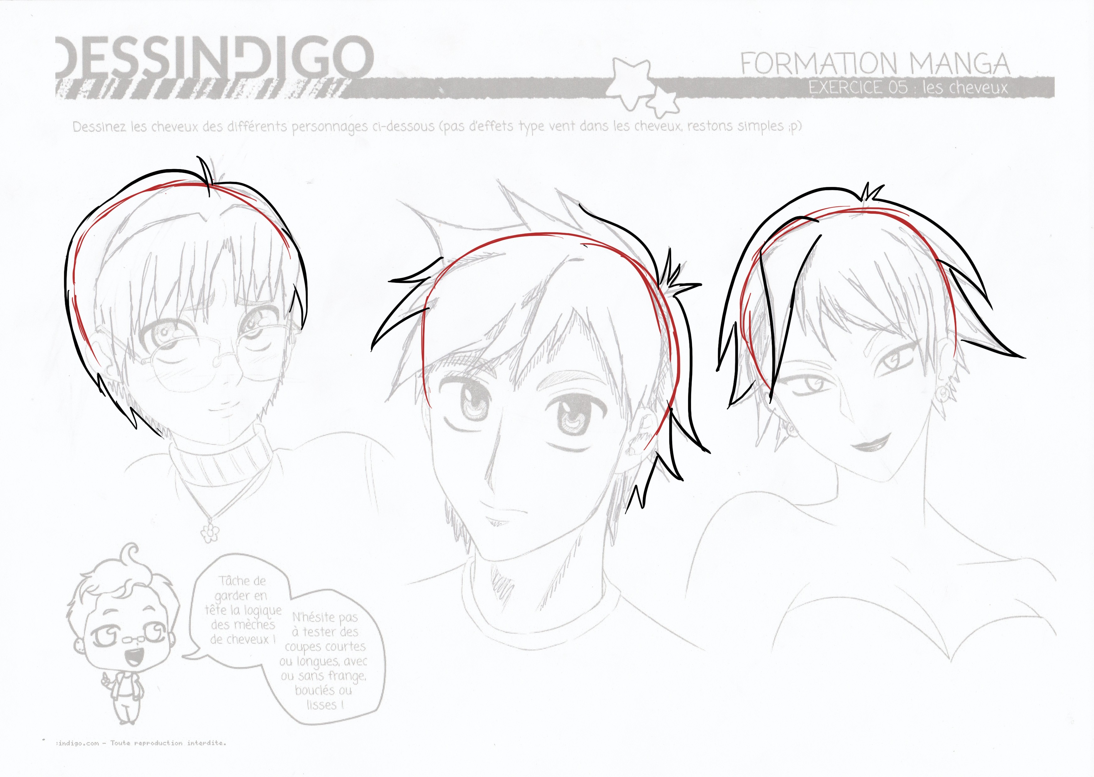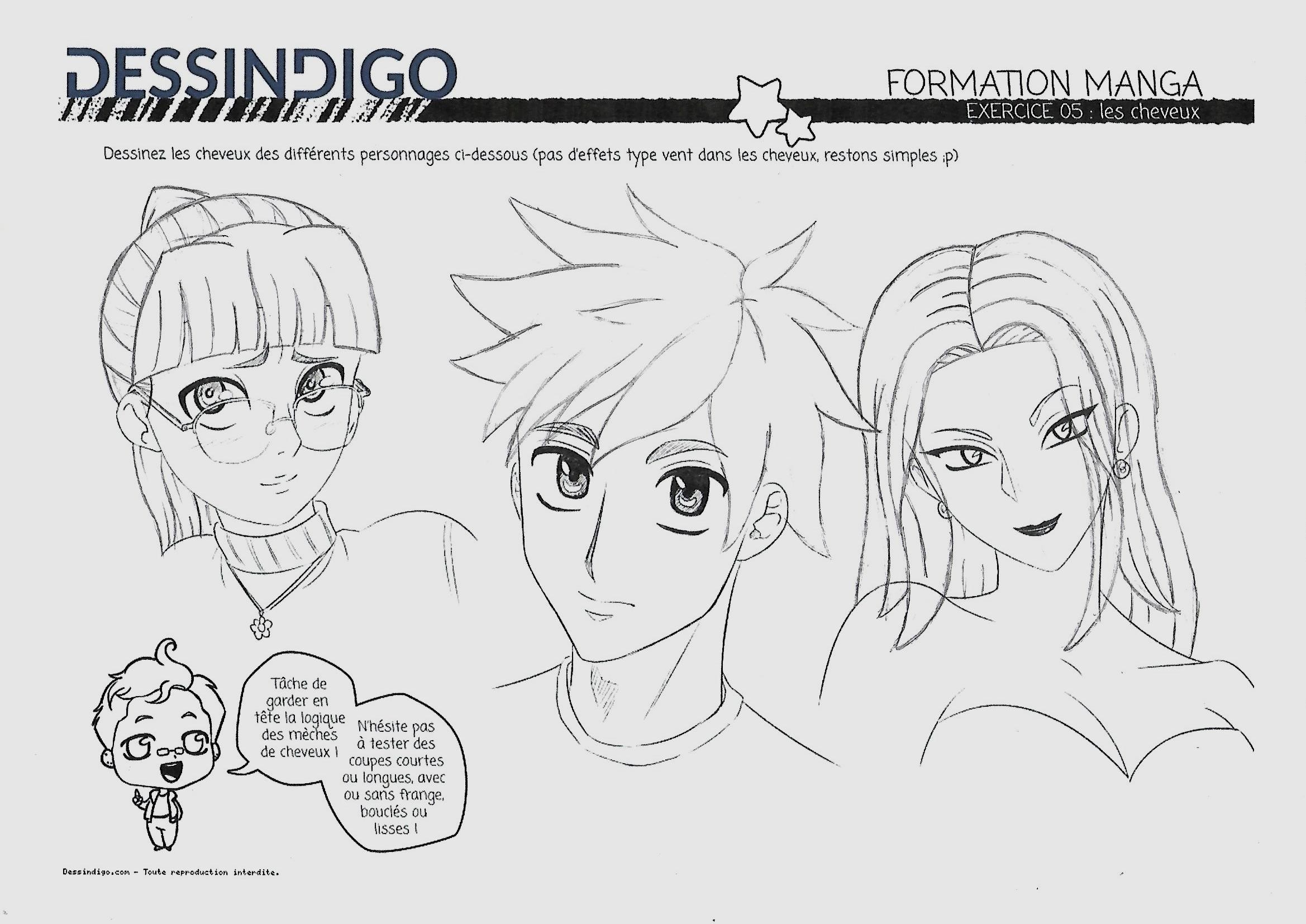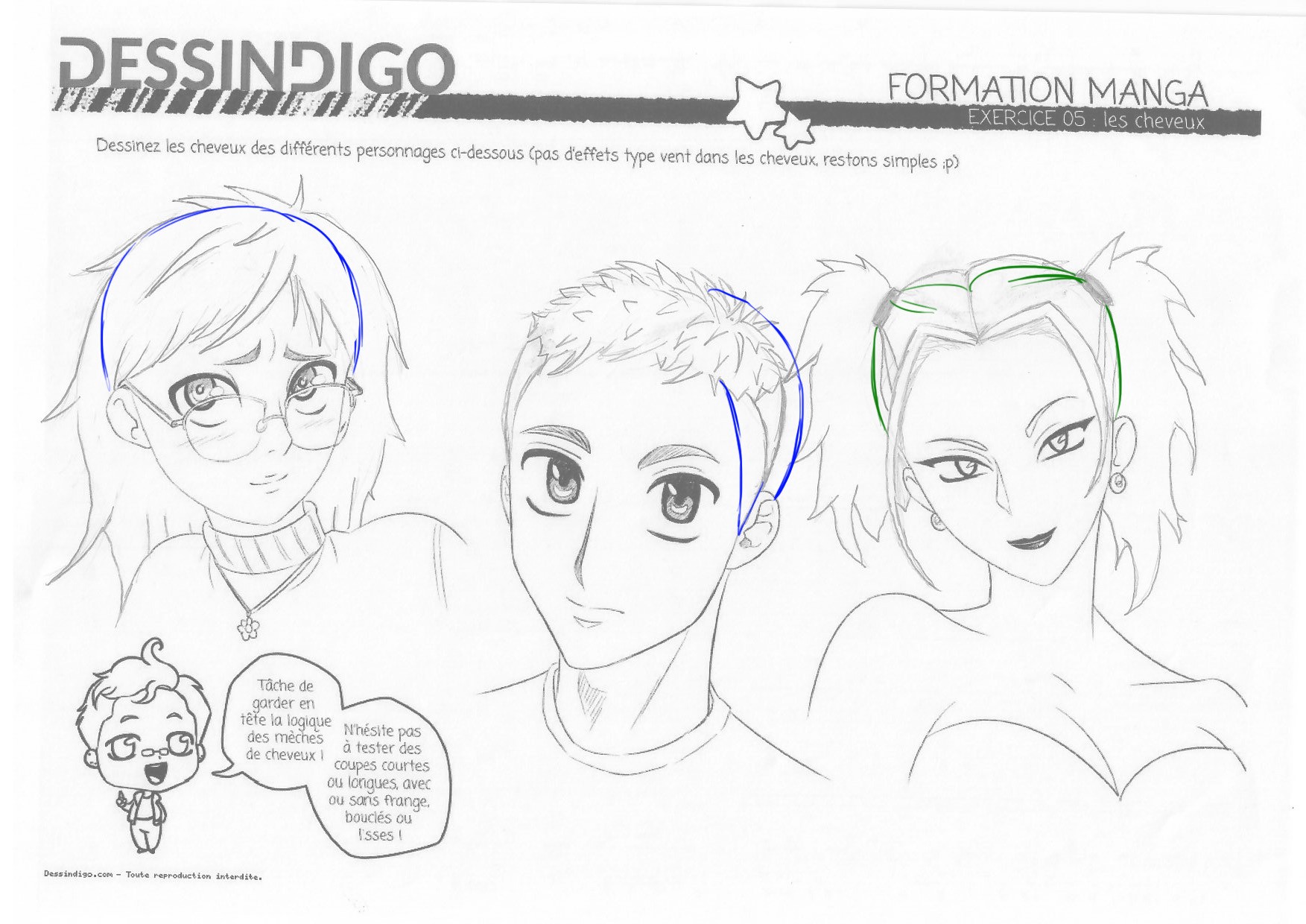 Et pour le tout premier, il manque un bout de cheveux, on devrait normalement voir l'implantation sur le côté droit de la tête. Concernant la frange, fais partir les traits des mèches depuis un point central en n'oubliant pas de suivre le volume (pas tout plat comme ici), la frange est posée sur le front, et le front est bombé, donc je devrais voir des courbes.