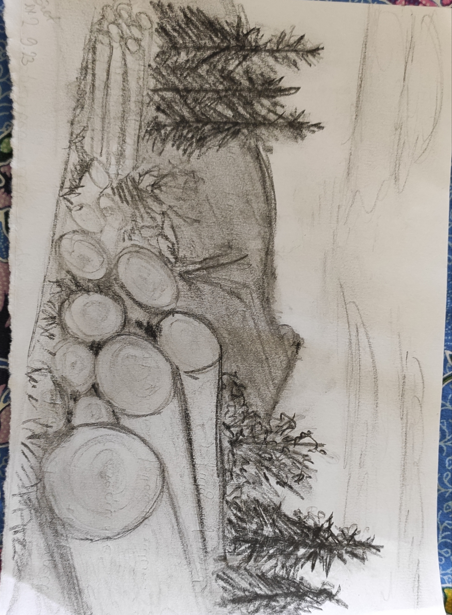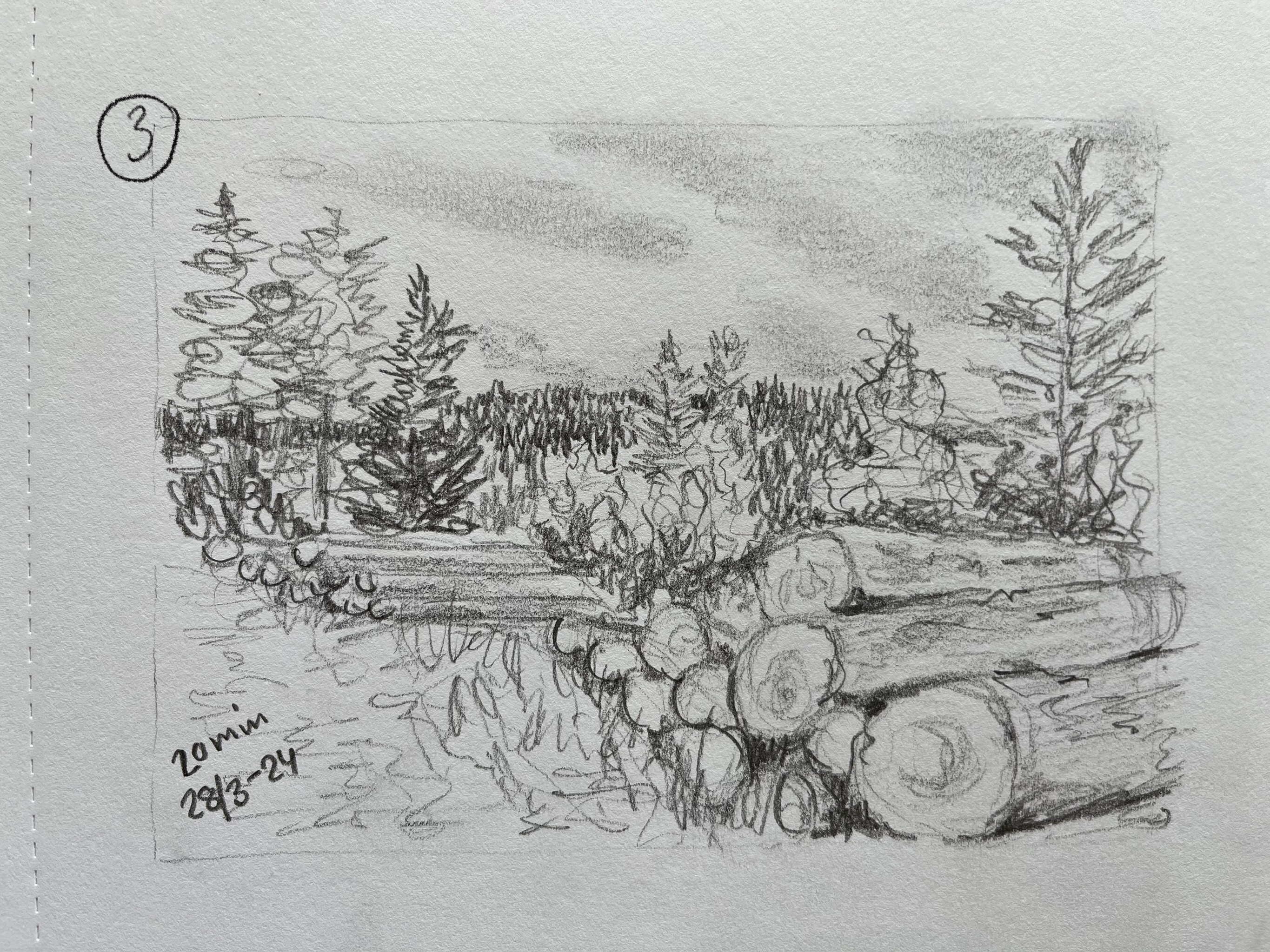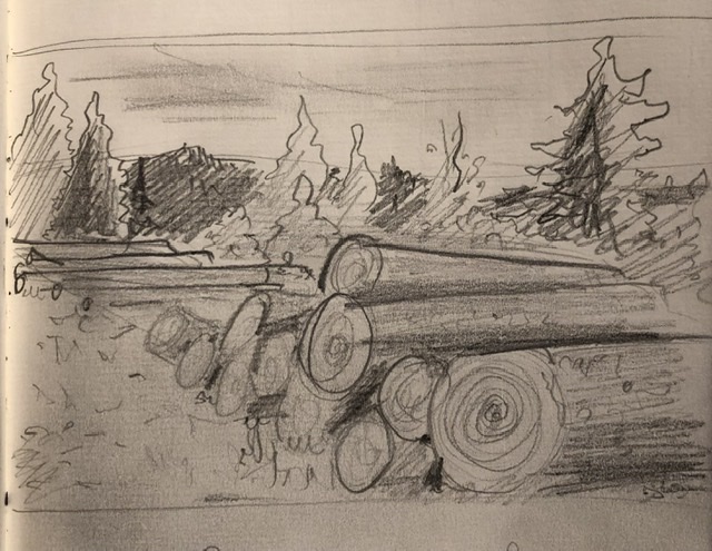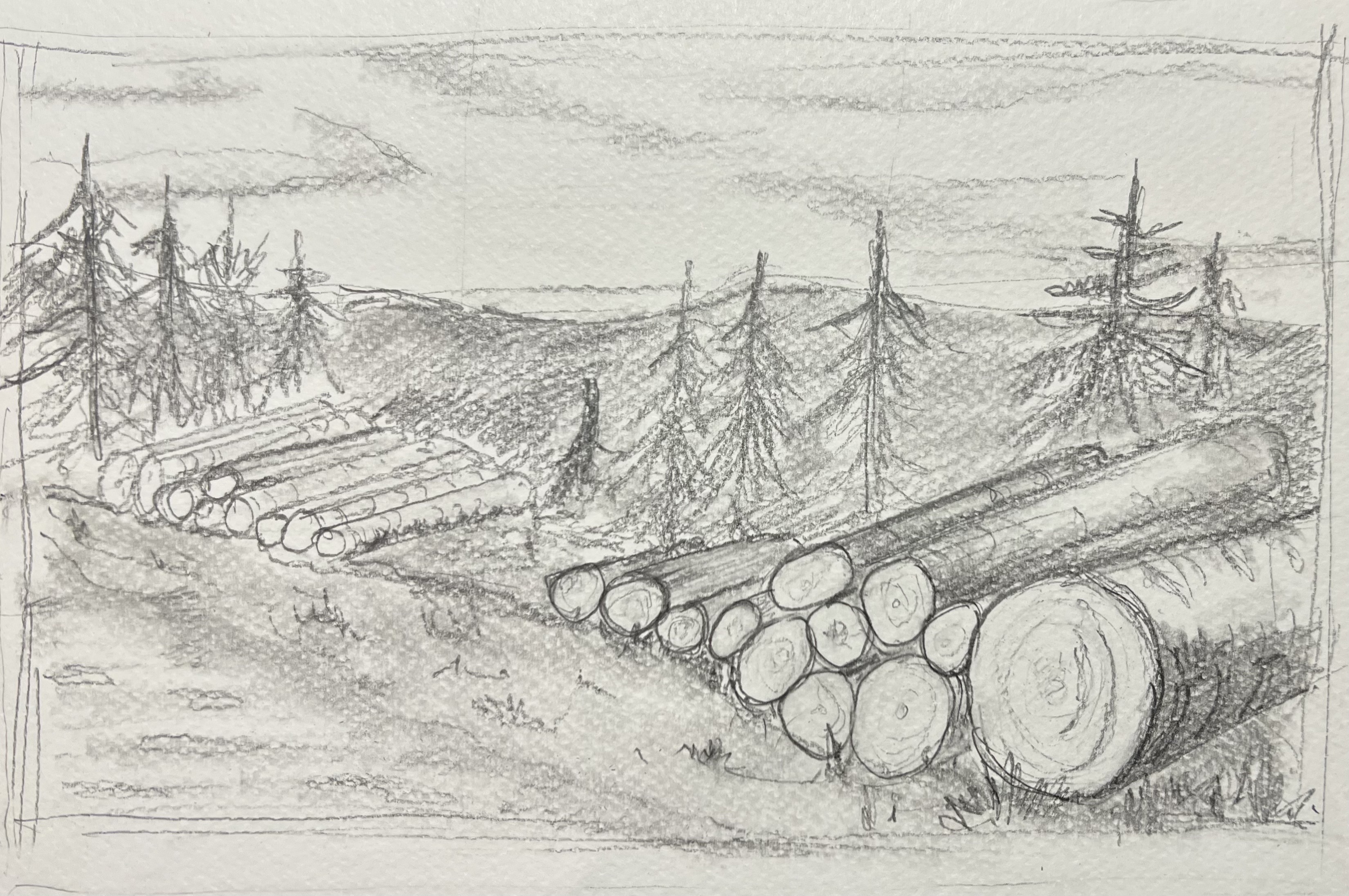 Le challenge avec l'estompeur c'est de ne pas trop l'utiliser car effectivement à force il ramolli le dessin. Par exemple ici, il est le bienvenu sur les sapins du fond mais sur le grand de gauche, qui se trouve proche de nous, il de vrait etre à peine présent pour laisser place au crayon, avec le rythme du crayon.