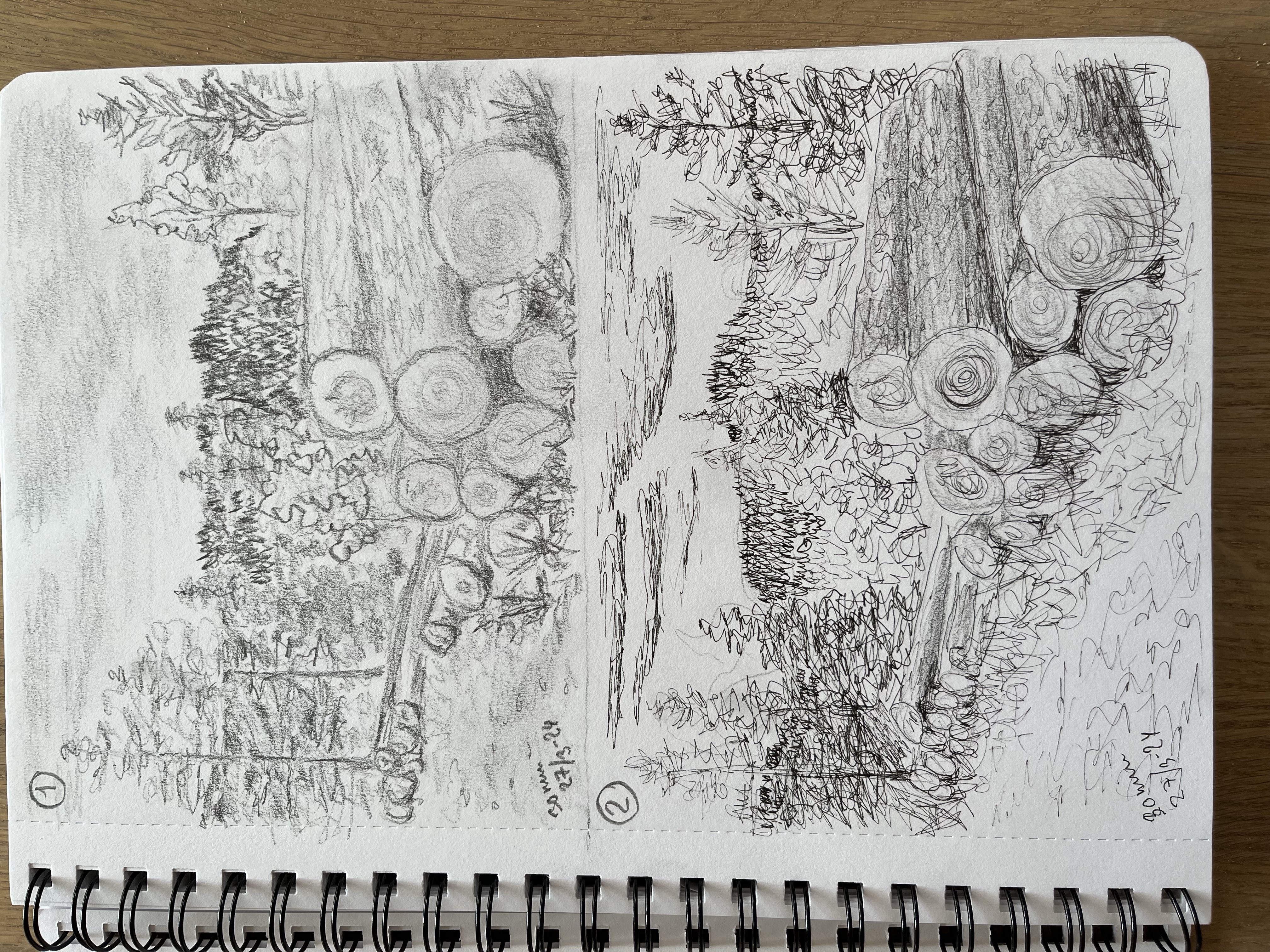 voici mes troncs d'arbres crayon 4B (1) et feutres 0,1 (2). J'envoie une 3eime esquisse ...
