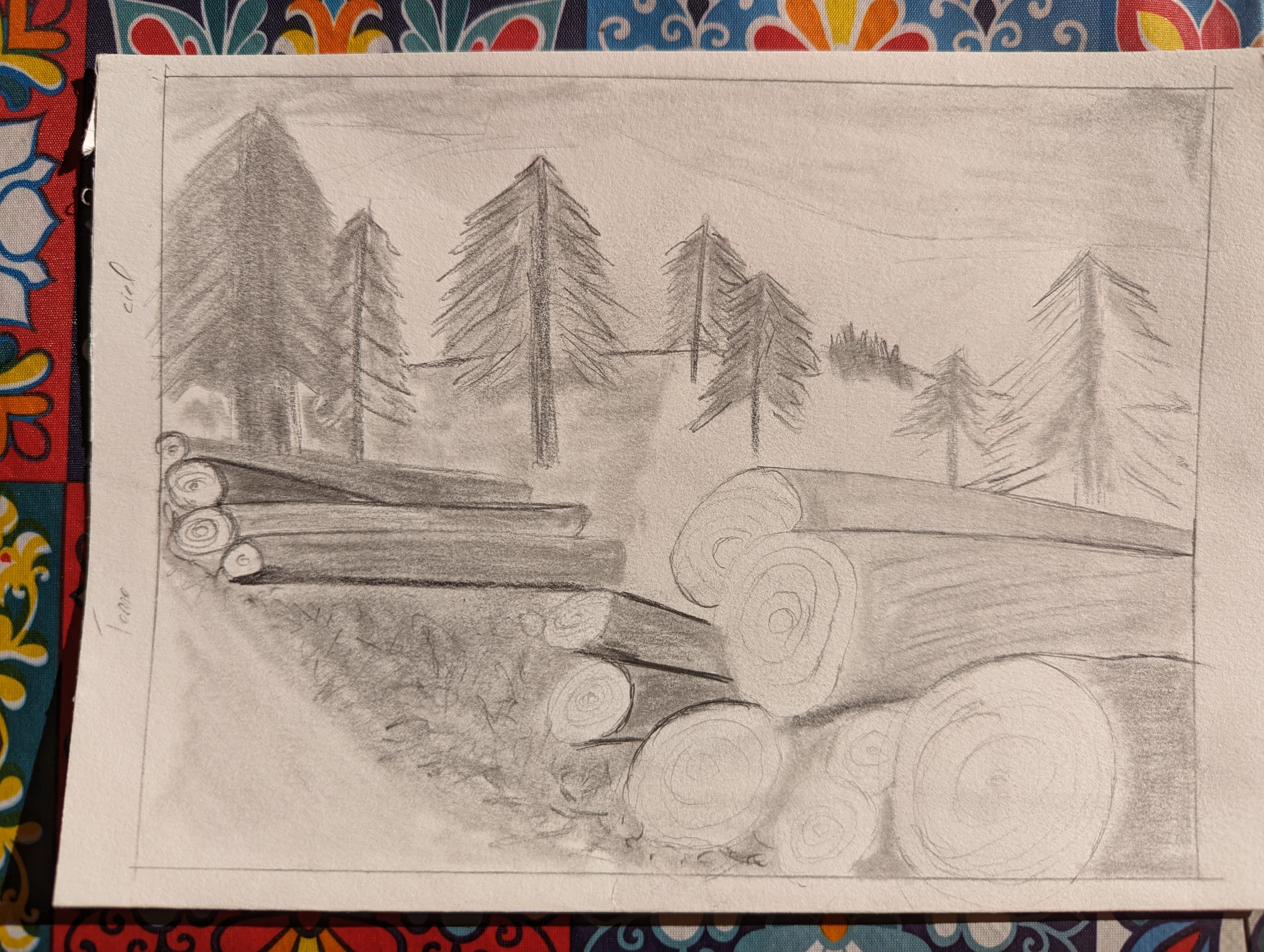 C'est grâce au rythme du crayon quon peut faire ressentir la texture. Pareil sur les troncs du premier plan : ils devraient être plus foncés, plus marqués.