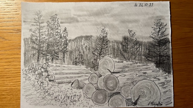 Ci-joint le deuxième exercice. Je me suis encore perdue dans la végétation. Où j'ai vraiment l'impression de gribouiller. Par contre, contrairement au premier exercice, j'ai pu le faire très rapidement.