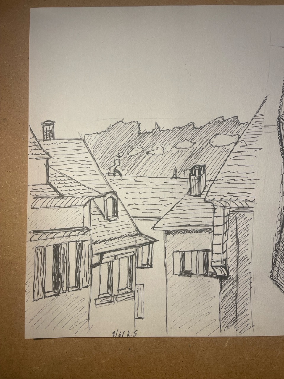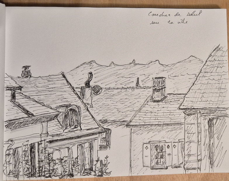 Ce style te va à ravir ! Pour le dernier plan, ne double pas ton trait ou utilise le feutre 0,1 pour donner l'impression que cela s'efface dans l'atmosphère et au contraire un 0,3 pour les maisons. Ca créera du contraste