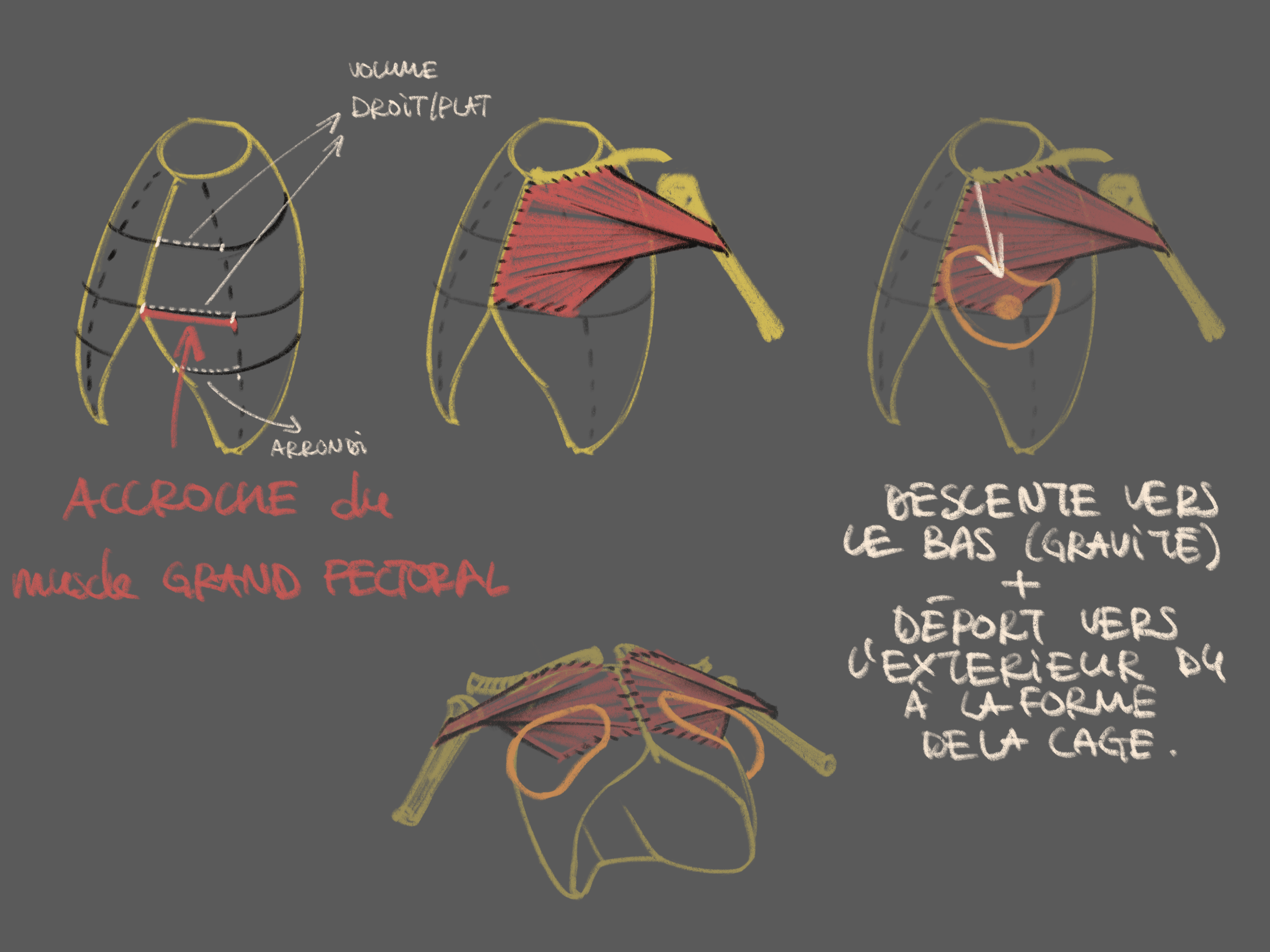 Oui voici un petit exemple. Il faut comprendre avant tout que le sein est un tissu principalement adipeux, il ne contient pas de muscle. Cette poche de graisse est posée en avant du grand pectoral mais est indépendante du muscle, le gras est accroché à la peau. Lorsque le bras se déplace, le sein bouge avec lui en suivant les déformations du grand pectoral mais c'est surtout parce que l'on étire la peau de nos épaules/bras. Plus l'âge avance plus la peau perd en tension, les seins peuvent donc moins bouger lors des mouvement des bras. Ce volume adipeux là peut être plus ou moins important suivant les morphologie, la plupart du temps asymétrique et, à nouveau sivant les morphologies, ne pas avoir le même comportement bras levés/tendus/fléchis, etc. Mon schéma est très généraliste et ne présente qu'une masse petite de graisse pour montrer plus facilement le lien entre cette poche et la forme de la cage et du grand pectoral. La masse adipeuse répond à la gravité et n'est située que sous la peau, plus le volume du sein est important et plus il va descendre et se déporter vers les côtés de la cage. C'est le même principe suivant l'âge, lorsque l'on avance dans l'âge notre peau se relache petit à petit, elle est moins tendue et donc la masse du sein est moins retenue.