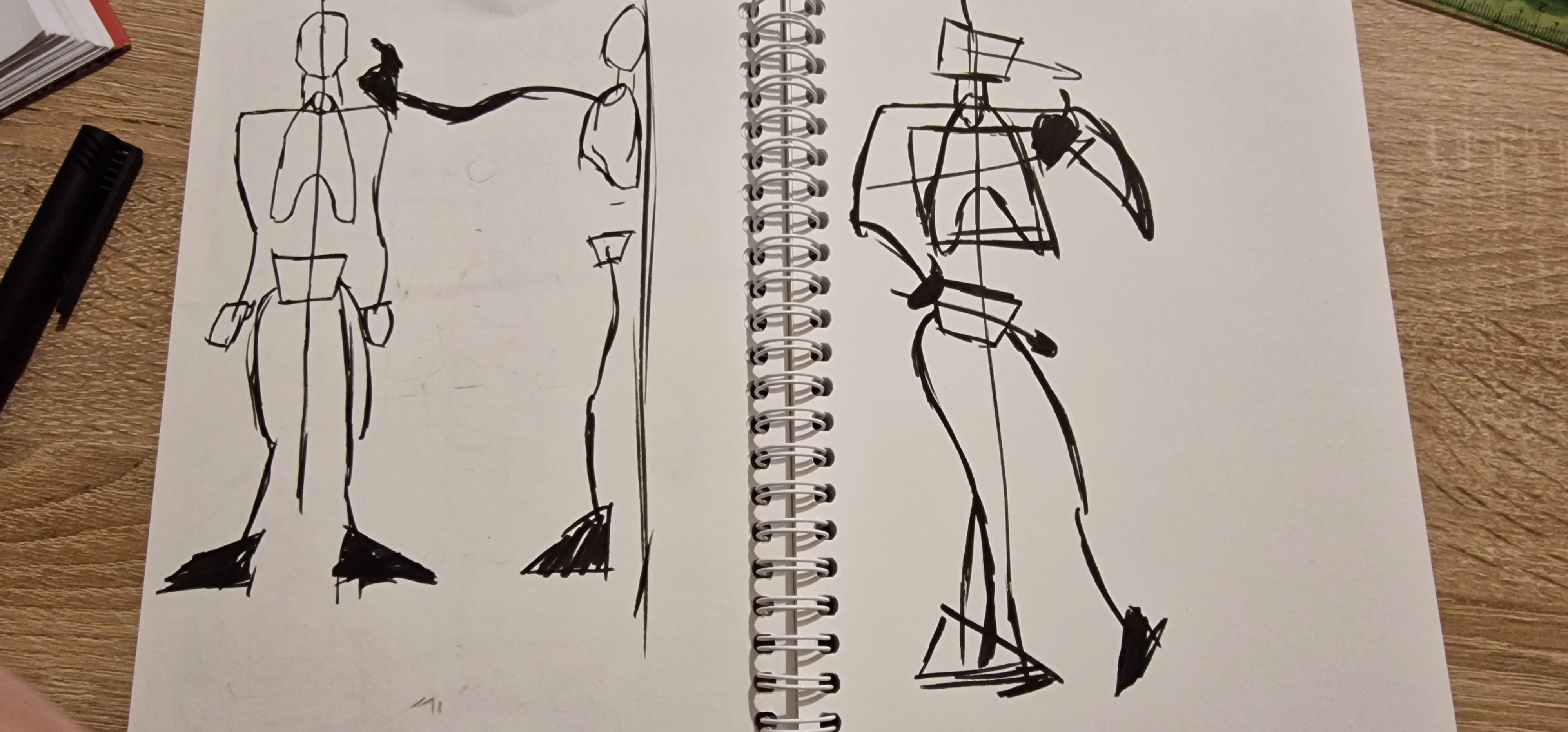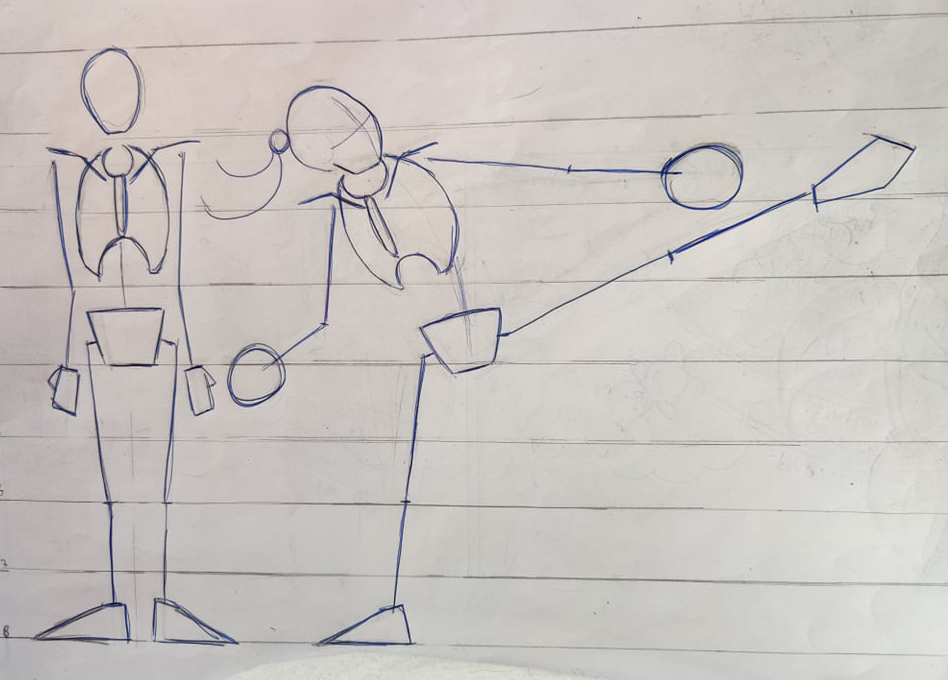 Bravo, c'est excellent ! La posture est impeccable, le David se tient très bien. Le Marcel est top aussi. Pour la tête du David je te suggère une boite, une sphère ou les deux entremélés pour bien indiquer le volume, ici on se rend pas très bien compte de la forme ou de l'orientation.