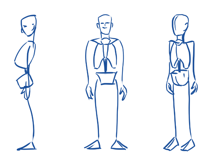Je te propose une petite correction sur chaque vue : Le profil mériterait d'être un peu plus incliné, le corps humain a une courbure naturelle sur cette vue en "S". Sur la vue de fase, ton marcel est très (très très très très) large, je l'ai affiné un peu pour te montrer un gabarit plus courant.