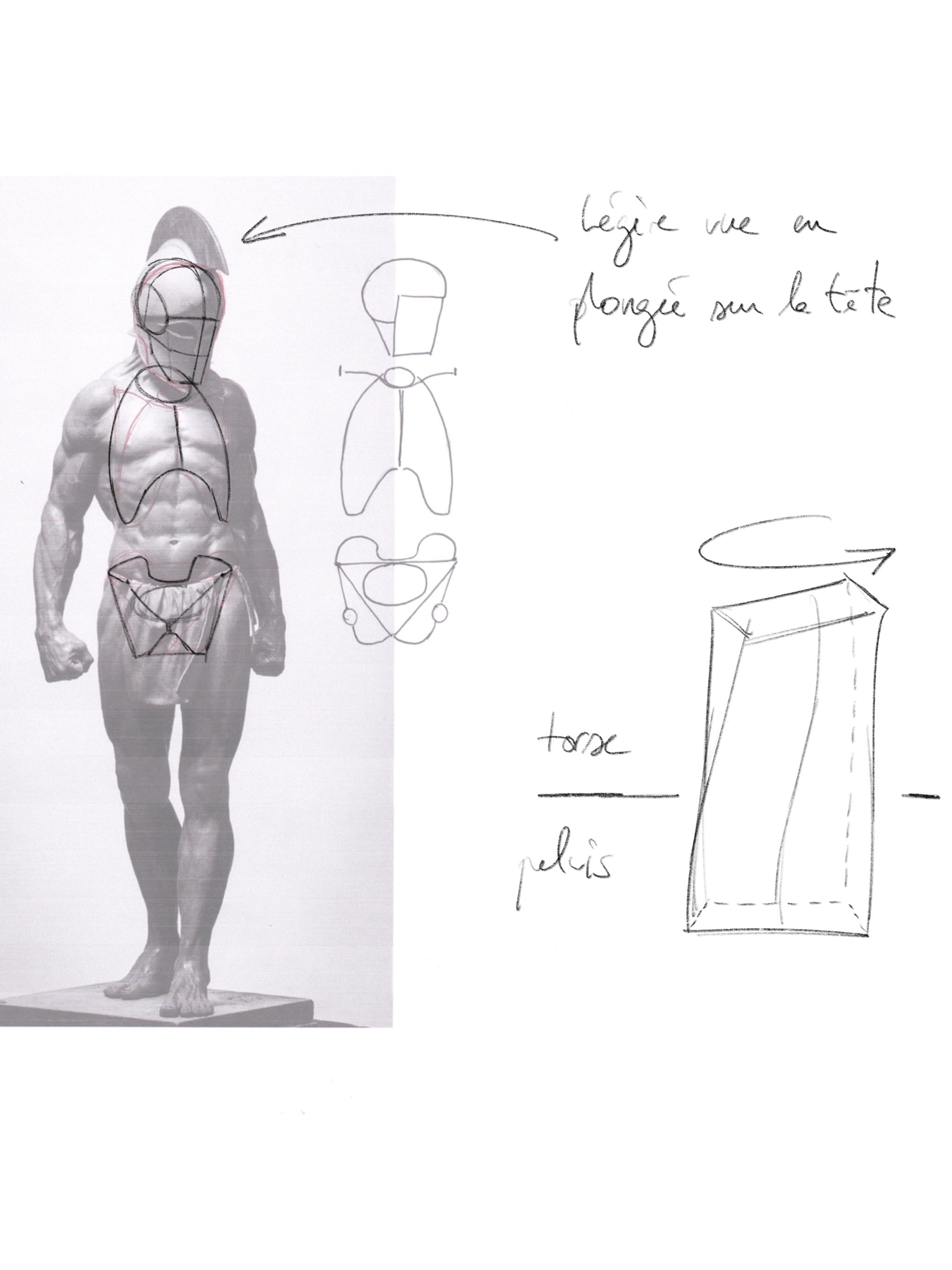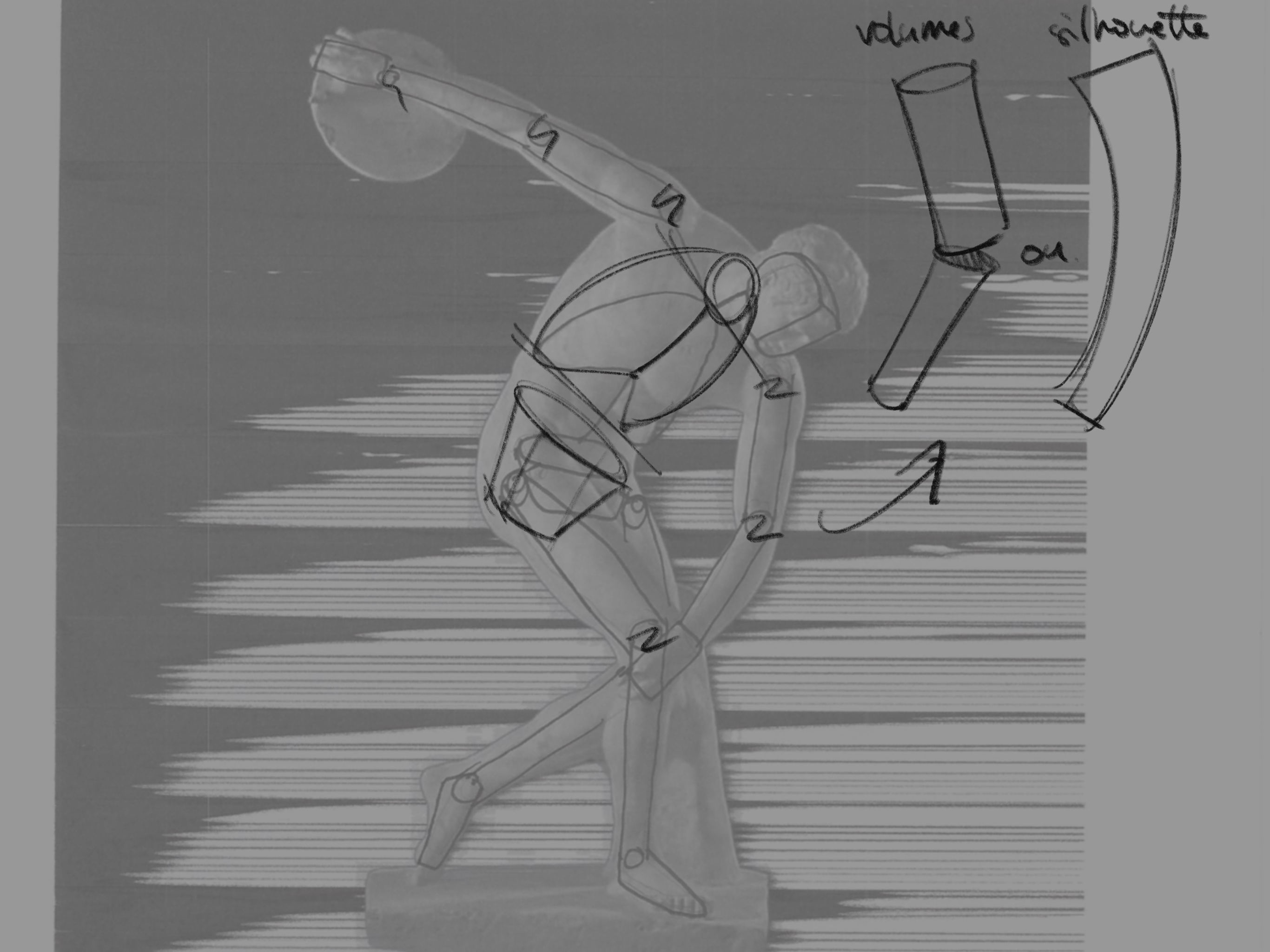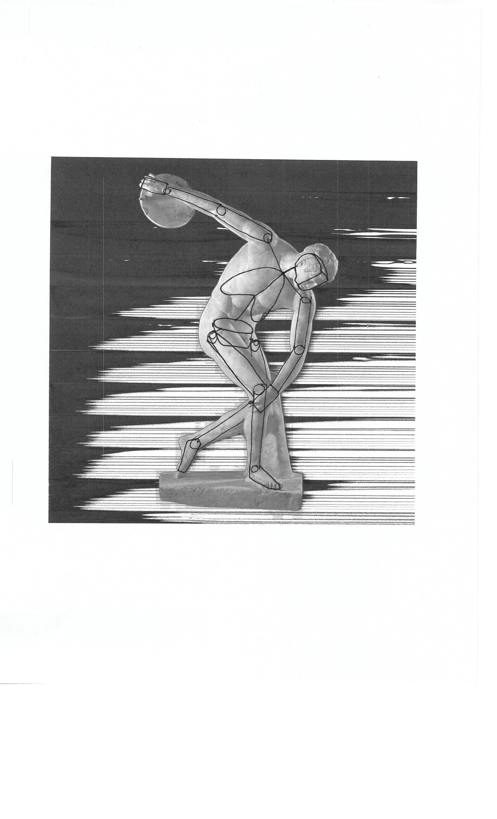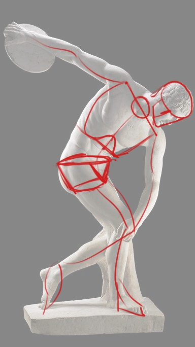 J'ai déjà corrigé ton David sur un cours précédent si je ne me trompe pas, je t'envoie un dessin pour le discobole donc. Cela va de paire avec la Vénus aussi. Dans l'idée tes cages sont un peu petites, essaye de bien cerner que le haut de la cage c'est la largeur et la base du cou. Quand tu ne vois pas le rachis ne le place pas et fies toi davantage aux repères osseux visibles. Je te propose aussi pour les membres de travailler soit en volumes soit en silhouette. Le tout sans les boules aux articulations... ;)
