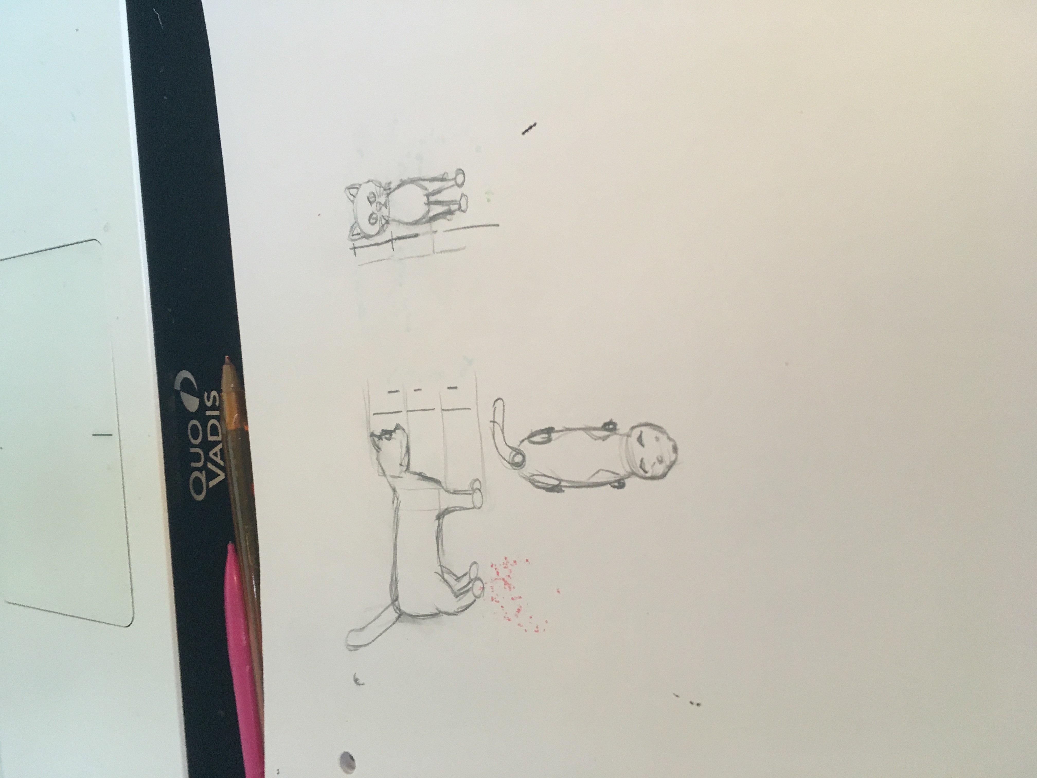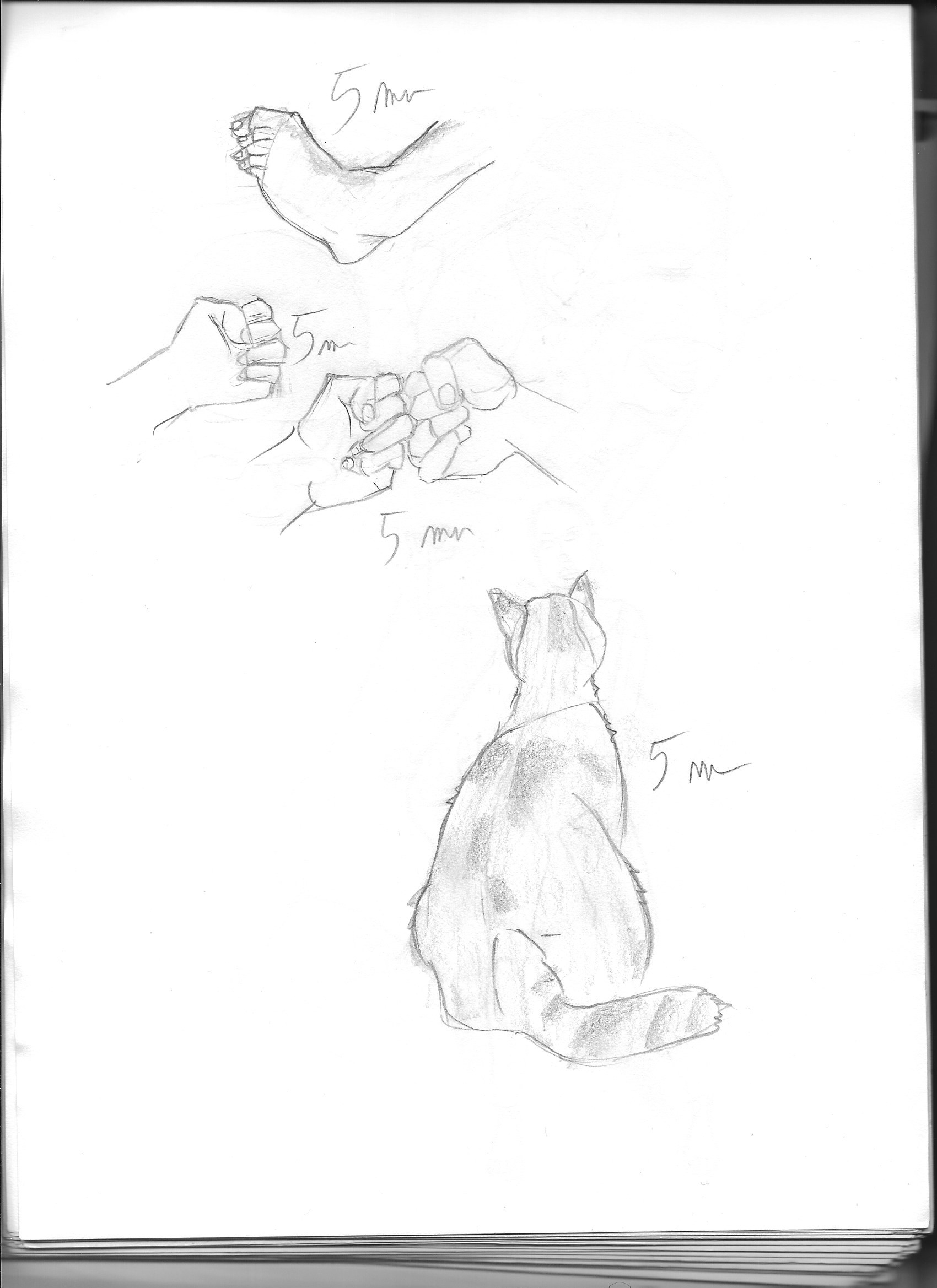 et ça fait plaisir de voir ton étude... moi aussi je débute en dessin, et en plus de suivre les conseils mentionnés dans la formation, voila comment je m'y prends pour progresser. Plusieurs fois par semaine je fais des séances de croquis rapides (5 à 10 mn max par croquis, mais on peut encore faire moins) sur les sujets qui me préoccupent, d'après des photos de sites spécialisés pour les étudiants en dessin (line of action, et senshistock que j'ai découvert grâce à Rakjah). C'est super difficile au début, on n'a jamais le temps de finir ce qu'on a commencé, on rate 8 croquis sur 10, mais... on progresse avec le temps ! Si je voulais mieux comprendre les chats, je ferais donc d'après photos plein de croquis de chats dans toutes les positions, 5 mn ou 10 mn par croquis, et ensuite je me lancerai avec des croquis d'après de vrais chats (qui eux ne restent jamais en place, sauf quand ils dorment !). J'ai joint pour illustrer mon propos une partie des croquis que j'ai faits aujourd'hui, dont 1 chat vu de dos. Attention, tout ça est imparfait, mais c'est 10 fois mieux que ce que je faisais en septembre quand je me suis lancé avec la formation. Je te souhaite bon courage pour tes études de chats (ou de ce que tu veux d'autre) et bravo pour l'essai que tu viens de publier, les animaux, je trouve ça difficile dans l'ensemble.