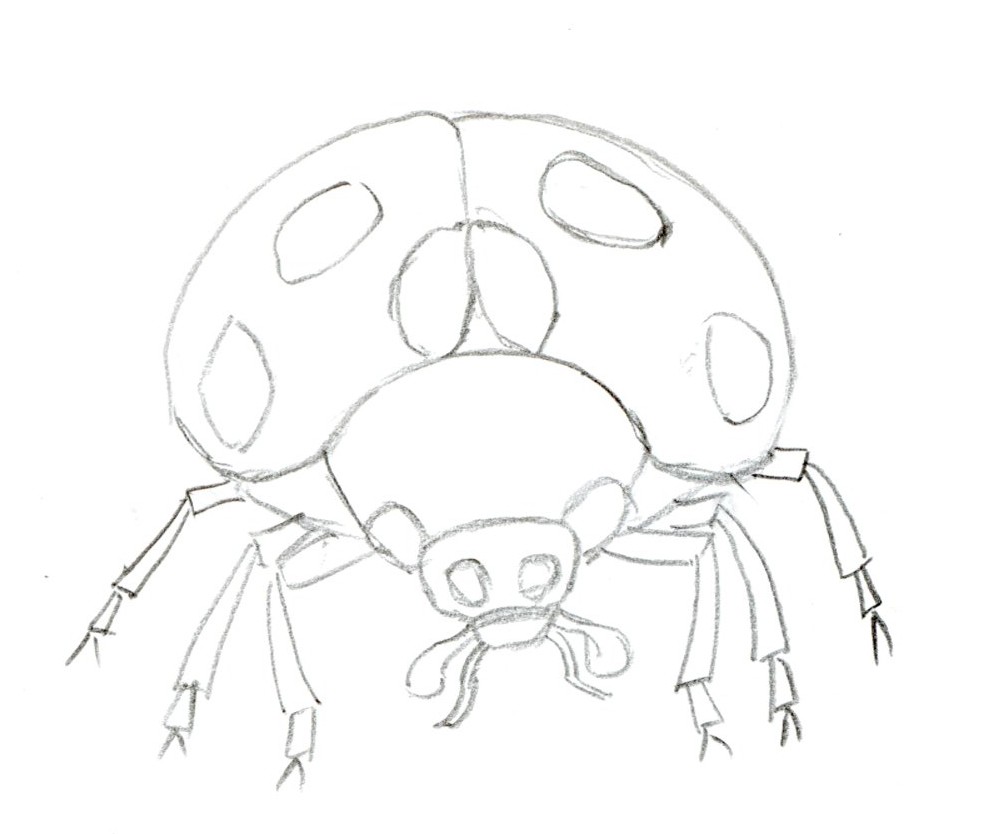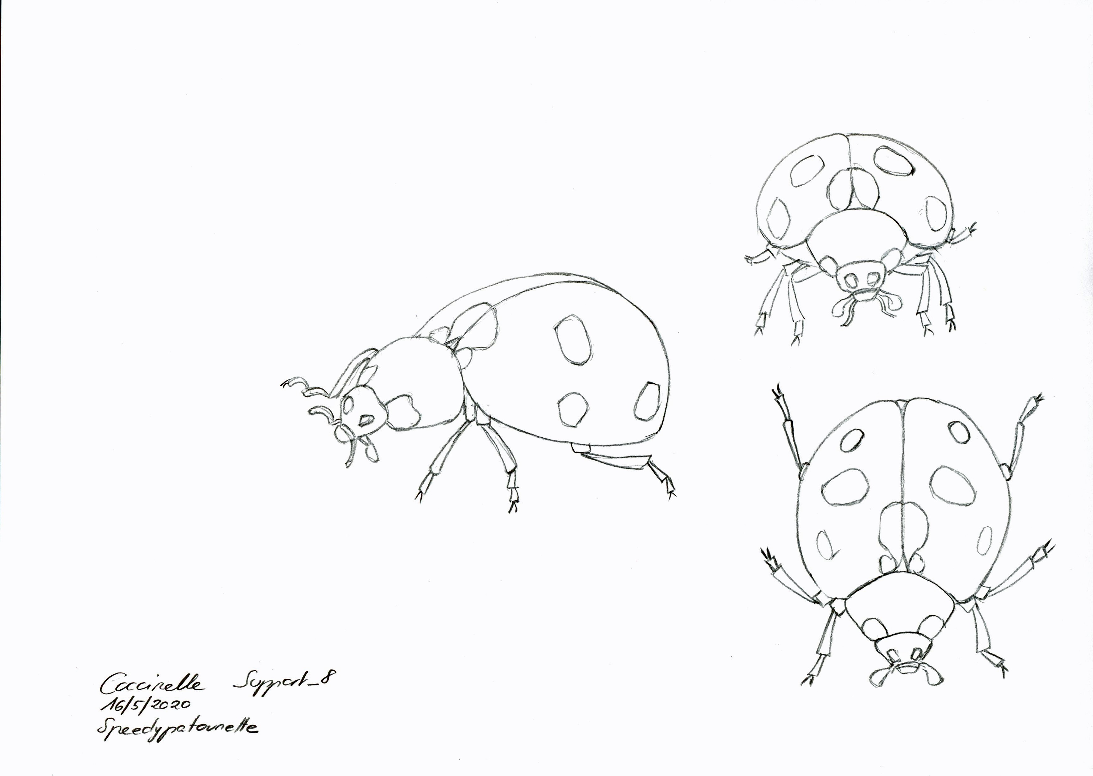 Il est top ton dessin! Tu as très bien compris comment était construit l'insecte, c'est super! Pour la vue de face, je pense que les pattes arrières devraient plus partir à la verticale!