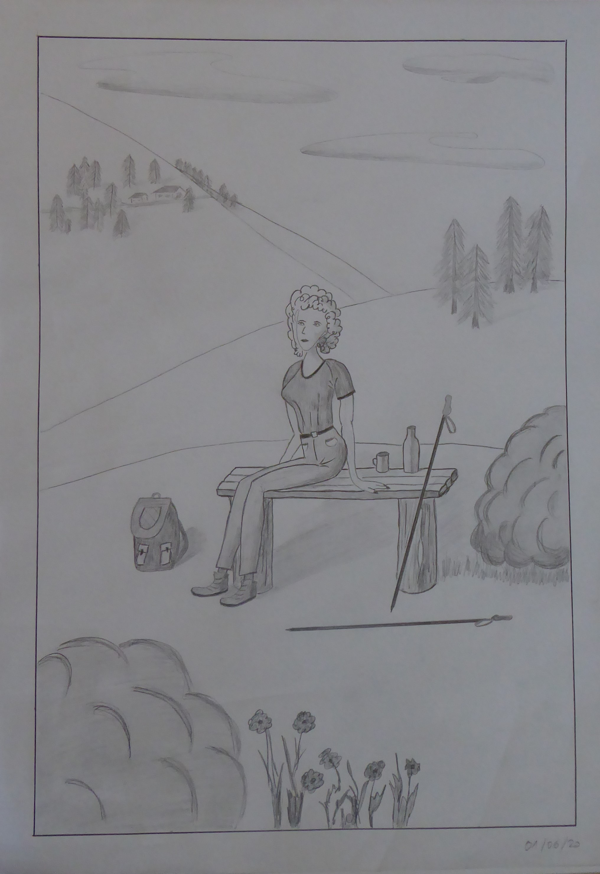 Enfin, le troisième a un personnage. Quelle galère pour obtenir quelque chose d'à peu près bien. Heureusement qu'avec la tablette lumineuse, je pouvais reprendre les éléments qui me paraissaient ok sans tout devoir redessiner. Les tutos sur les dessins des personnages assis m'ont beaucoup aidés. D'ailleurs la demoiselle est celle du tuto avec quelques petites modifications.