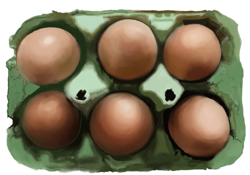 Ta palette de couleurs est très bien, il y a beaucoup de nuances pour les œufs, ça leur apporte beaucoup de réalisme et de couleurs riches, c'est très réussit :) Maintenant je te conseil d'essayer de poussser un peu le rendu pour bien retranscrire les matière, par exemple d'avoir des œufs encore plus lisse et d'accentuer d'avàatge au contraire l'zspect cartonné de la boîte :)